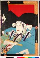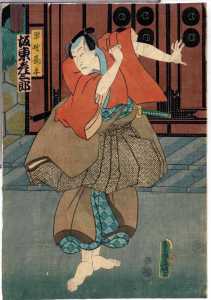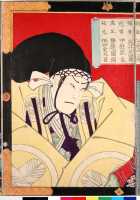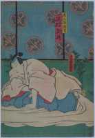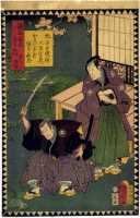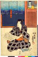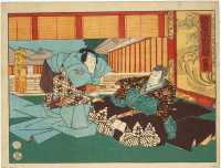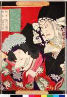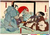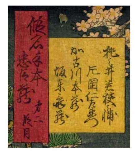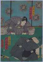 上次展示的绘画作品实际上就是著名的日本浮世绘中的芝居绘。“芝居”指的是戏剧,“芝居绘”就是戏剧绘画的意思,其中最多的是版画,也包括少量手笔画。展示作品属于彩色版画,即通常所说的“锦绘”。作品所画的是《假名手本忠臣藏》第一幕中的一个场面,而且是由三幅作品横向组合而成的。左边一幅画的是穿淡黄色衣服的判官,中间一幅画的是高师直和颜世夫人,右边一幅画的是穿淡蓝色衣服的若狭之助。作品中间展开的卷轴上依次记载有“桃井 市川左团次”、“师直 河原崎三升”、“颜世 岩井半四郎”、“判官 中村玩雀”、“画工 丰原国周”、“板元 桐谷堂丸甚”。据此查阅上演记录,可以得知该作品画的是明治5年(1872)5月4日在东京守田座开始上演的《假名手本忠臣藏》中第一幕的一个场面。演员及角色分别是——“桃井 第一代市川左团次”、“师直 第七代河原崎权之助(演出时的艺名,“三升”是日后的艺名。)”、“颜世 第八代岩井半四郎”、“判官 第三代中村玩雀”。作品的画工为丰原国周,出版商为桐谷堂丸甚。在卷轴最右边处盖有一个不起眼的圆形印,这便是“改印”。所谓“改印”,指的是政府的审查印,凡通过审查的出版作品上均盖有此印,其形式及内容随时代而变化。展示作品中的“改印”上刻的是“壬申四”,即明治五年四月。从时间上来看,该作品创作于公演之前,属于预先创作。