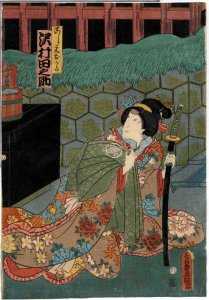 在第三幕第一场中的最后,一般会有两个重要人物出场,不过在现行演出中有时也会省略。这两个人物便是早野勘平和阿轻。勘平是盐冶判官的随从武士,陪主人判官前来足利公馆。阿轻是判官的妻子颜世夫人的贴身侍女。由于颜世夫人打算将写给高师直的回信先交给判官,再由判官转交给高师直,所以让阿轻前来送信。阿轻本来不用急着赶来送信,但是因为想早点与勘平见上一面,还是早早地赶来了。只是二人的幽会却为之后二人的不幸埋下了伏笔。这里还得再提一提丑角伴内。喜欢阿轻的伴内出来干扰勘平和阿轻的相会,滑稽中也给即将展开的紧张而沉重的后续带来一丝短暂的轻松。