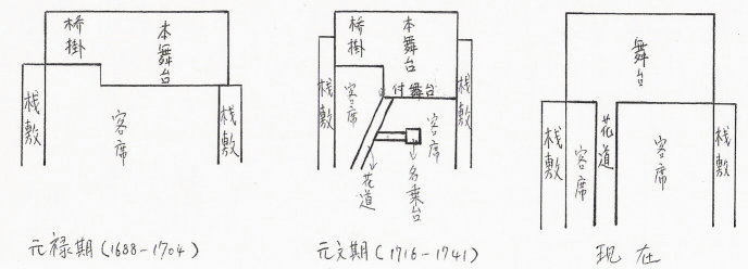 一出戏的上演首先离不开剧本、剧场、演员、观众等几个要素。产生于十六世纪末十七世纪初,兴盛于江户时代(1604-1867)的歌舞伎,在剧本创作、剧场经营、上演前后的宣传、演出评论、明星崇拜等各方面,非常具有自己的独特性、创造性和超前性。要知道这一切,也许最好的办法就是选择一出比较有代表性的歌舞伎戏,对它从开始准备到正式上演再到事后评论的全过程进行观察分析。但是这样展开下去面太大,不如让我们先来看看一出戏是如何在舞台上展开演出的过程,也好对歌舞伎表演有一个直观的了解。既然这样,就先简单说说歌舞伎的剧场和舞台。在北京,至今还保留着一些老的京剧舞台。它们曾经所在的戏馆、戏楼,大多三面为楼,中间为席。其实歌舞伎剧场的基本形式与此相类似。最早的剧场就是先搭一个能(日本传统戏剧的一种)的舞台样式的舞台,再用席子及竹栅栏等物围住四周,观众则在舞台周围席地而坐。能的舞台大小与老的京剧舞台的大小差不了多少,但它没有“将出”“相入”,而是在舞台自身右后方有一条走廊式通道,它通向右边的演员出入口,也兼做舞台的一部分。以后随着表演内容的复杂化,以及大型道具的增加,舞台逐渐变得更宽更深,走廊式通道也逐渐演变成大舞台的一部分。后来又出现了花道,即由舞台自身正面偏右的地方延伸而出,穿过观众席直至设在观众席后面的一处演员出入口的通道。演员常常利用花道进行亮相、报名的表演。早期的花道右侧还设置有“名乘台”,它是从花道右侧中间部分延伸到观众席中间的一个不大的亮相、报名的台子,以后也被花道所取代。说完舞台的基本情况后再来说说观众席。本来是露天的观众席也因为观众层次、身份、人数的变化和需要开始发生演变。先是在舞台前面的左右两侧搭建带有屋顶的,被称为“栈敷”的特等席。其后随着演出需要及观众人数增加等原因,开始起楼造屋使舞台和观众席成为一体化的室内剧场。不过在江户时代,歌舞伎剧场也曾因为风纪问题,遭到过禁止造楼、禁止在“栈敷”前挂廉等处分。在明治以后,由于受到西方文化的影响,座位开始从日本式座位变成西洋式的椅子座位,席位也增加了不少。正因为如此,现在已经很难找到当年那种富于传统味道的小型剧场。
