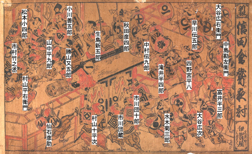 (1)松本小四郎、(4)市村竹之丞、(1)山中平九郎 (1)村山平右衛門、(1)勝山又五郎、(1)小川善五郎 (1)生島新五郎、(1)秋田彦四郎、(1)中村伝九郎 (1)滝井半四郎、(1)四野宮平八、(1)中島勘左衛門 (1)早川伝五郎、(1)大谷広右衛門、(1)富沢半三郎 (1)大谷広次、(1)水木菊三郎、(2)市川団十郎 (1)市川団蔵、(1)村山十平次、(1)仙石彦助