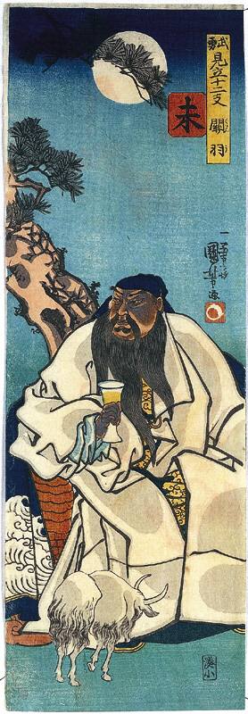 国芳の描いた関羽は他に「通俗三国志英雄之壹人」「武勇見立十二支 未」「五将軍見立五人男 ばんずい長兵衛」などがある。このうち「通俗三国志英雄之壹人」をのぞいては関羽を何らかに見立てた絵である。見立てられた関羽に動きはなく、座っているだけの姿として描かれている。そのことから、見立は関羽の存在・見た目そのものからと考えられる。羊と関羽との関連は、羊毛と髭との見立との考えがなされている。ばんずい長兵衛との見立絵は、絵自体は市川白猿(五代目市川海老蔵)演じる長兵衛が描かれており、関羽自身の登場はない。