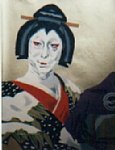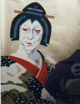 膳をささげる政岡の立姿を捉えた。乳母政岡は立女形の役で、知性と気品に加え、我が子への慈愛に満ちた演技が要求される大役である。合羽摺で金箔に彩られた背景は、荘厳な武家の気風に満ちており、役者の品位と艶気が感じられる。(M)
