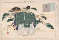 翁の舞である。この翁が纏っている装束は、翁烏帽子に翁狩衣、そして指貫である。とりわけ狩衣は、蜀江文様と決まっており、他に例は無い。 今日における「翁」は正月や祝賀、記念能などの番組の冒頭で演じられ、特別な祝いの場で我々は見ることが出来る。老体の神が祝福をもたらすという民俗信仰に関係し、子孫繁栄、天下泰平、国土安穏、五穀豊穣を祈る。 翁は別名「式三番」と呼ばれ、父尉、翁、三番猿楽(三番叟)の3演目を指す。面そのものが神体とみなされ役者は舞台でそれぞれ父尉、白色尉または肉色尉、黒色尉の面をつける。現在の上演では父尉を省略する形が一般的で翁は能役者、三番叟は狂言役者が演じる。「翁」は農耕との深いつながりがあり、また農村で生活をしていた庶民の風景を彷彿させる要素もある。