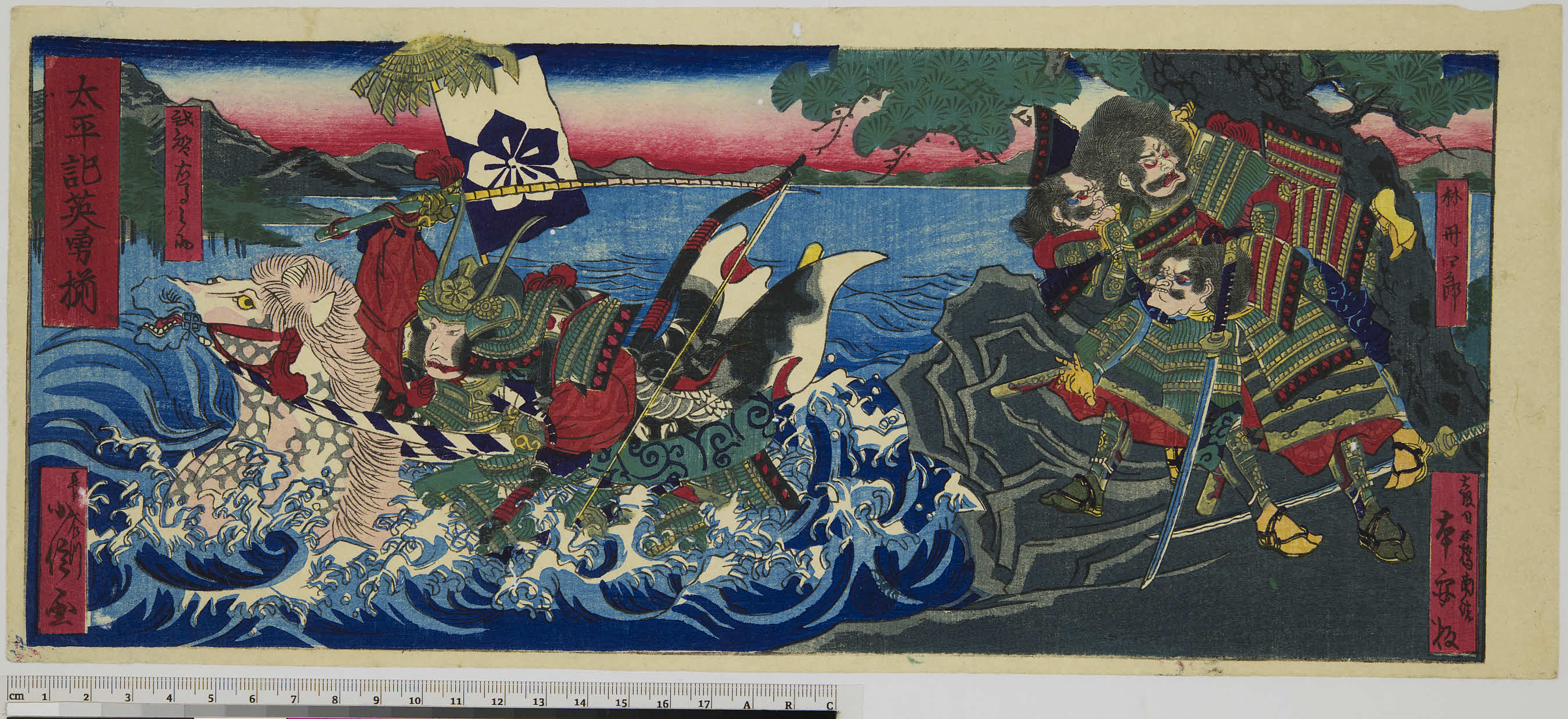 B4-06A 明智左馬之助湖水渡り1 巻5 明智左馬之助光春は、味方が次々に討死するのを見て、討手の堀の軍勢の中にただ一騎で割り入り、琵琶湖の湖水の中に一文字に乗り入れる。堀の兵士たちがあれよあれよと眺める中、左馬之助は比叡おろしの風に雲龍の陣羽織をはためかせながら、馬を泳がせていく。その武勇と風流に感心した兵士たちは、「よいやよいや」と声をたてる。 関連記事 B4-06B 明智左馬之助湖水渡り2 B4-06A-01 歌川芳虎 「源平一ノ谷合戦ノ図」... B4-06A-02 長谷川小信 「太平記英雄揃」 「武智右馬... 投稿日:2019年2月28日 by arc カテゴリ: 第四編 [編集]