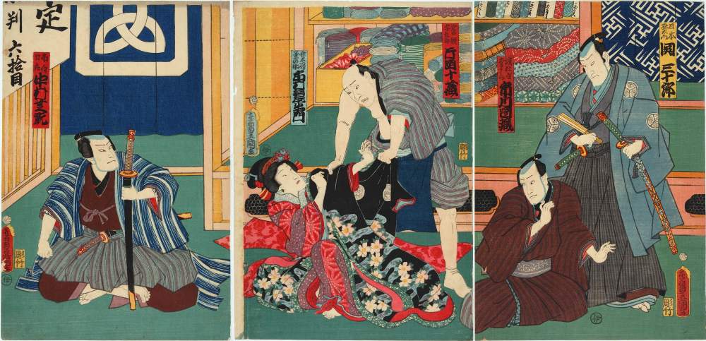 「青砥稿花紅彩画」の一番の見せ場、浜松屋の場面を描いたもの。弁天小僧が窃盗の疑いをかけられ、浜松屋の番頭与九郎に腕をつかまれている。右手には日本駄右衛門と浜松屋幸兵衛が描かれている。