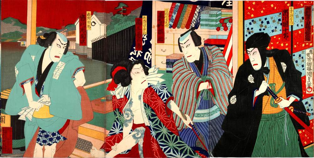 また、『続々歌舞伎年代記』のこの興行に関する記事からわかるように、尾上菊五郎病気欠勤の為、二番目が団十郎の「ちょいのせ」に差し替えられた。したがって本作品が予定稿として描かれた作品であることが分かる。(住宮)「日本駄衛門 市川団十郎」「南郷力丸 市川左団次」「浜松や幸兵衛 尾上松助」「弁天小僧菊之助 尾上菊五郎」