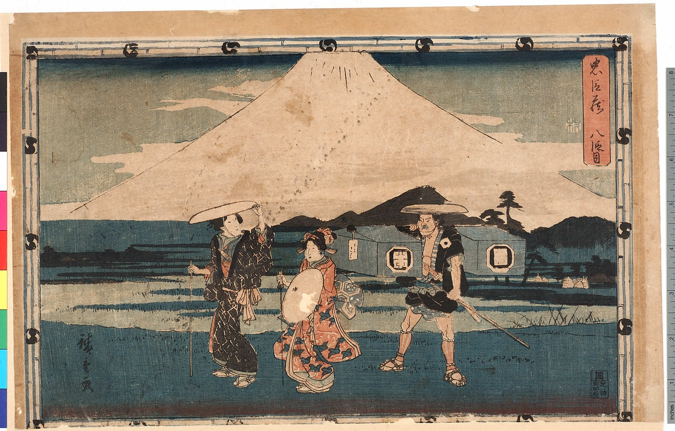 Home E 第五回展覧会 抒情の絵師・広重と奇想の絵師・国芳の忠臣蔵 E1 抒情の絵師・広重の忠臣蔵 E1.1 物語絵 E1.1.2.06 忠臣蔵 八段目 E1.1.2.06 忠臣蔵 八段目 絵師:歌川広重〈1〉出版:天保14年~弘化3年(1843~46)判型:横大判錦絵12枚揃のうち所蔵:立命館ARC作品番号:arcUP1178 八段目、戸無瀬・小浪親子の道行を描く。力弥と小浪の婚礼を実現させるため、山科へ向かう東海道の道中である。背景には見事な富士が大きく描かれる。尚、当時は、武家の子女のみで旅をすることはまずあり得ず、ここでは二人に付き添う奴も描かれている。 ID: 26233 Date:2025/11/06 by arc カテゴリ: E1.1 物語絵 [Edit]