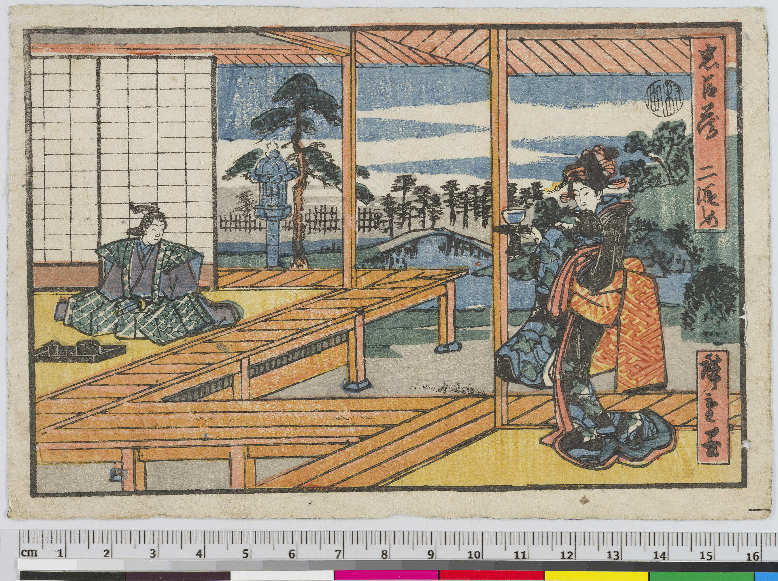 Home E 第五回展覧会 抒情の絵師・広重と奇想の絵師・国芳の忠臣蔵 E1 抒情の絵師・広重の忠臣蔵 E1.1 物語絵 E1.1.4.02 忠臣蔵 二段め E1.1.4.02 忠臣蔵 二段め 絵師:歌川広重〈1〉出版:天保14年~弘化3年(1843~46)判型:横小判錦絵12枚揃のうち 所蔵:立命館ARC作品番号:arcUP6492 二段目で選ばれたのは、「松切り」ではなく、「力弥上使」の場面。桃井館に使いにやって来たのは前髪姿の大星力弥、力弥に茶を運ぶのは許嫁の小浪である。二人の間には渡り廊下が横たわるが、そのジグザグとした形は八つ橋を思い起こさせる。『伊勢物語』の八つ橋の段では、在原業平が遠く京に残る妻への思いを込めた歌を詠む。男女の情愛に縁ある橋なのである。 ID: 26237 Date:2025/11/06 by arc カテゴリ: E1.1 物語絵 [Edit]
