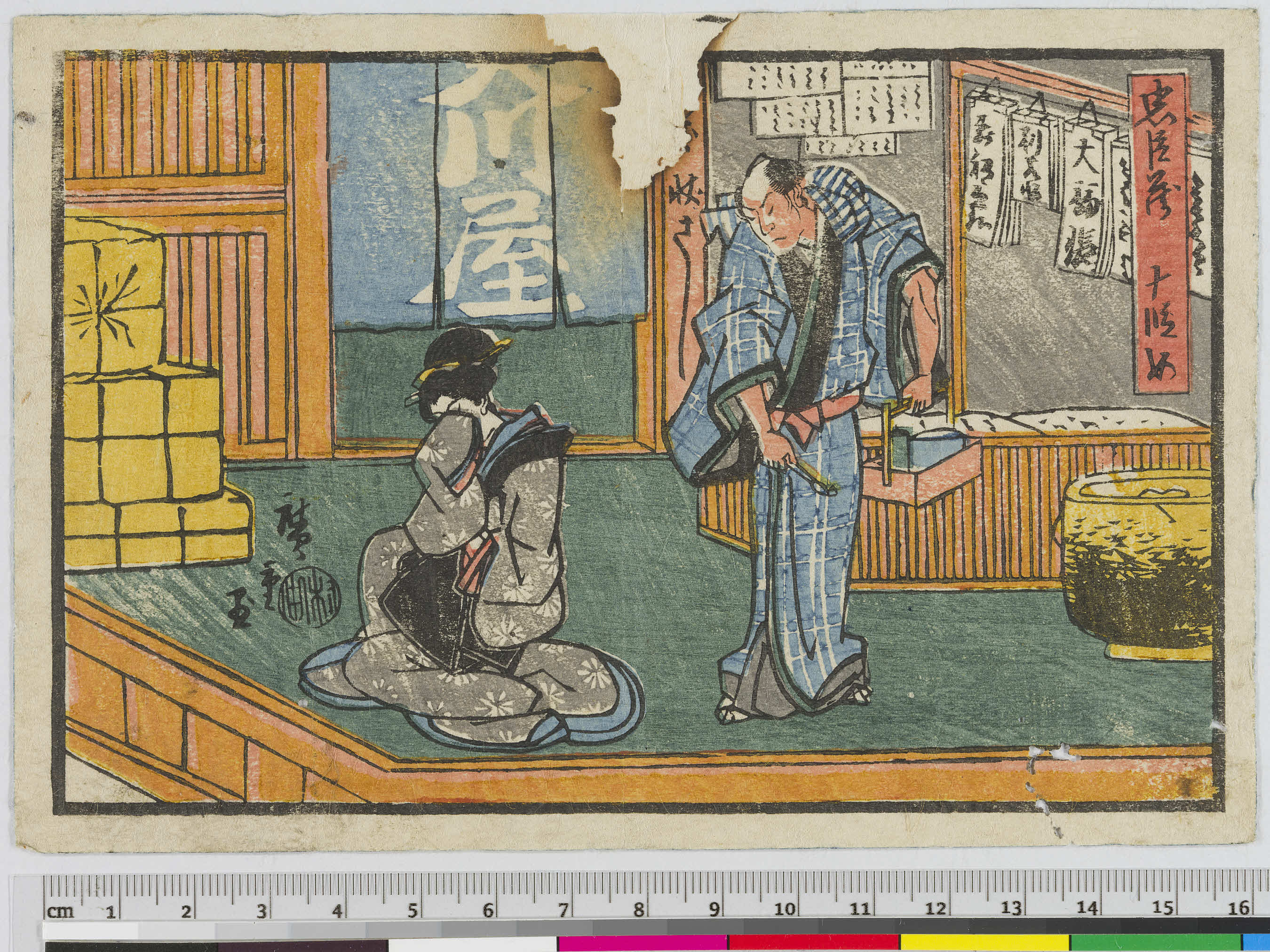 Home E 第五回展覧会 抒情の絵師・広重と奇想の絵師・国芳の忠臣蔵 E1 抒情の絵師・広重の忠臣蔵 E1.1 物語絵 E1.1.4.05 忠臣蔵 十段め E1.1.4.05 忠臣蔵 十段め 絵師:歌川広重〈1〉出版:天保14年~弘化3年(1843~46)判型:横小判錦絵12枚揃のうち 所蔵:立命館ARC作品番号:arcUP6486 十段目でよく描かれるのは、長持ちに腰をかけた義平の姿であろうが、ここでは、義平とお園という夫婦の愁嘆場が選ばれた。義平は事情があってお園を離縁したが、お園はそれで我が子にも会えないことを悲しみ、心情をせつせつと義平に訴えている。 ID: 26240 Date:2025/11/06 by arc カテゴリ: E1.1 物語絵 [Edit]