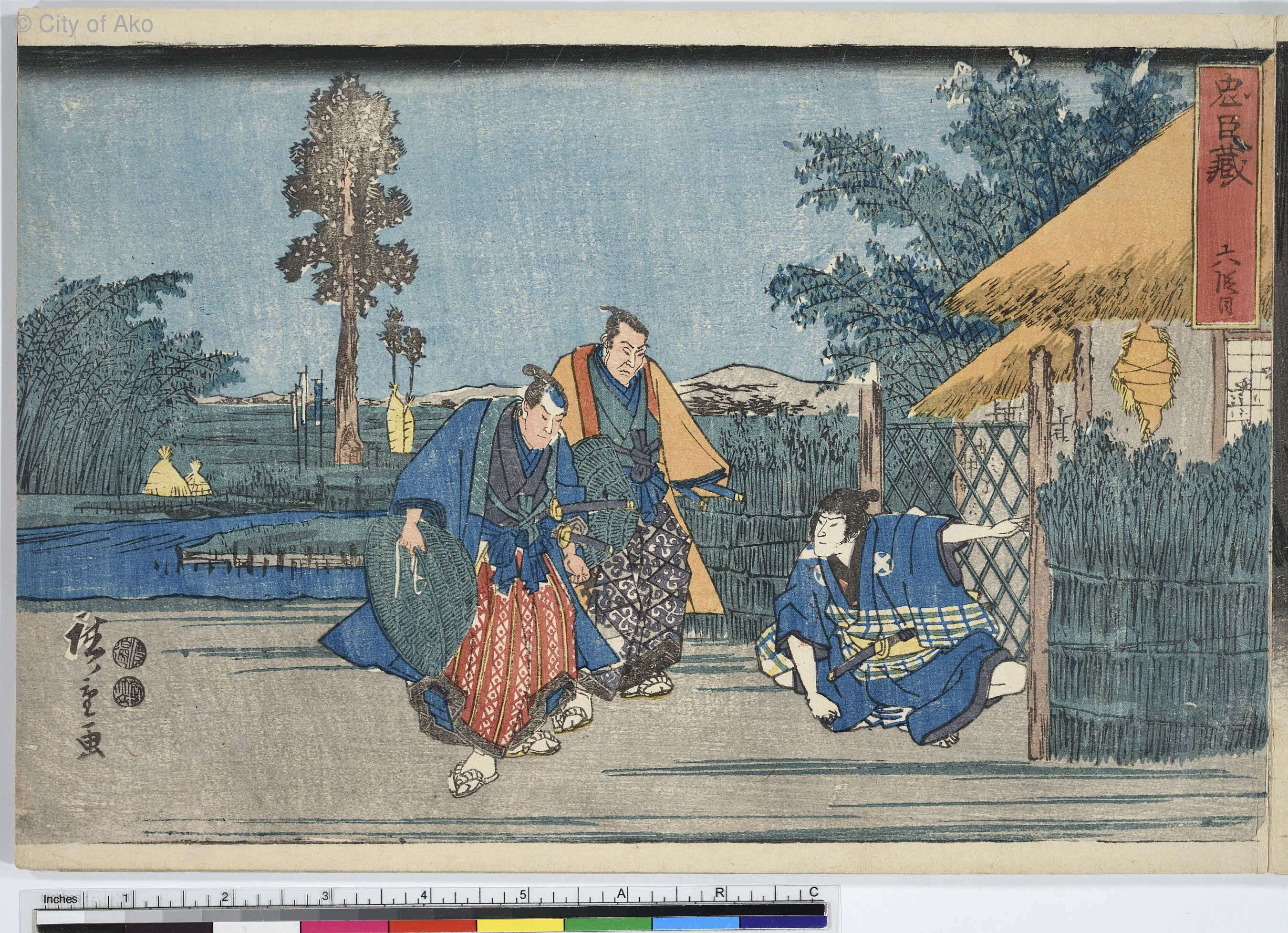 作品番号:AkoCH-S0024-06六段目は山崎の与市兵衛住居が舞台。昨夜撃ち殺したのは与市兵衛であったかもしれないという罪悪感にさいなまれながら、やむなくおかるを祇園の廓へ送り出した勘平が、木戸口で原郷右衛門・千崎弥五郎の2人の来訪を出迎える場面。この後勘平は、昨夜届けた金子を差し戻され、姑(しゅうとめ)からも舅(しゅうと)殺しを責められ、進退きわまって腹を切る。そして、勘平が息も絶え絶え事情を申し開きしたことで、死骸が改められて勘平への疑いが晴れ、今際の際に一味徒党の連判状に血判を許される。