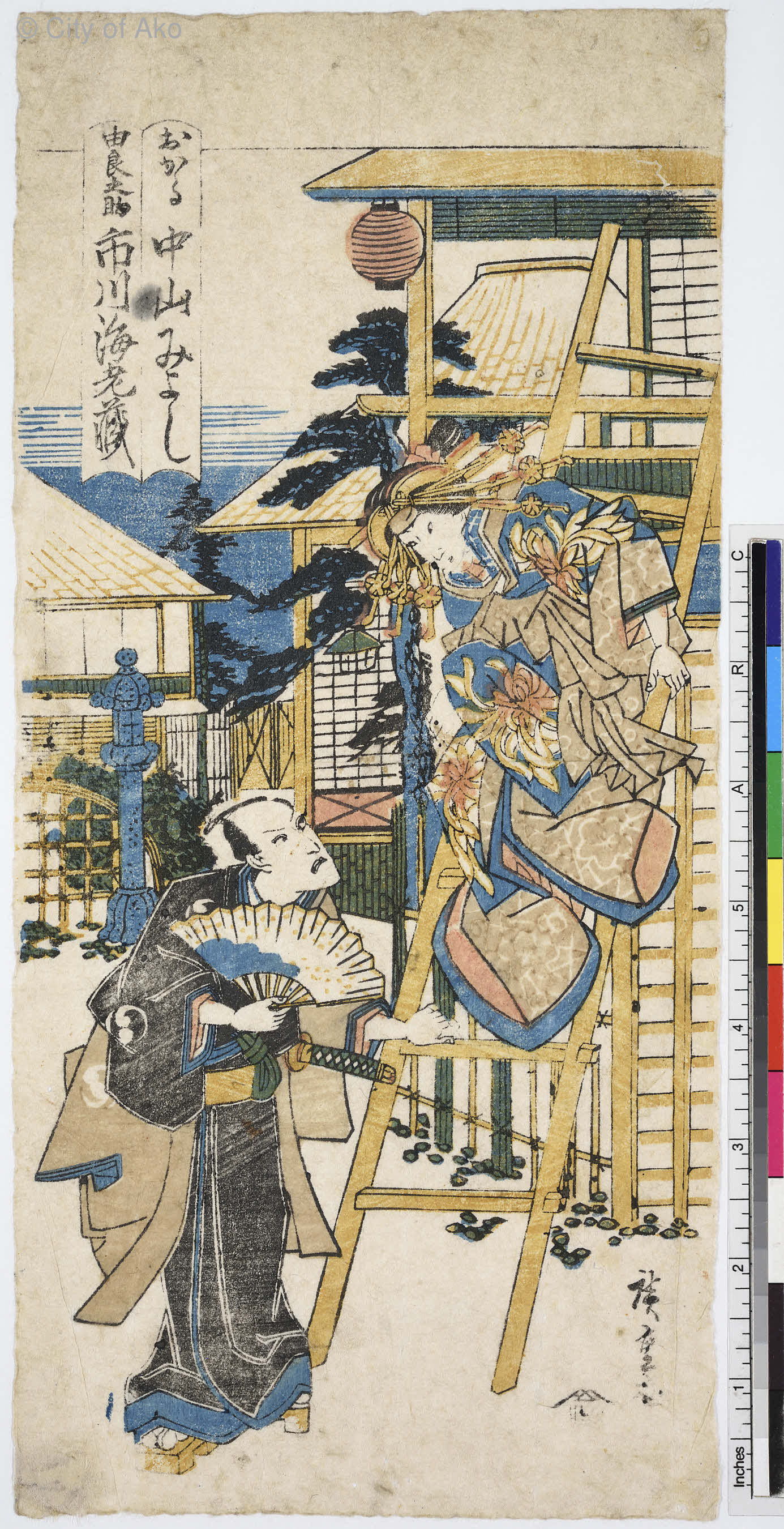 作品番号:AkoGA-G0027『仮名手本忠臣蔵』七段目の一力茶屋。顔世からの密書をおかるに盗み読まれてしまったことを悟った由良之助は、おかるに身請話をもちかけ、大事の漏洩を防ぐために殺してしまおうと考える。図は、階上にいたおかるを梯子を使って降りさせるところ。