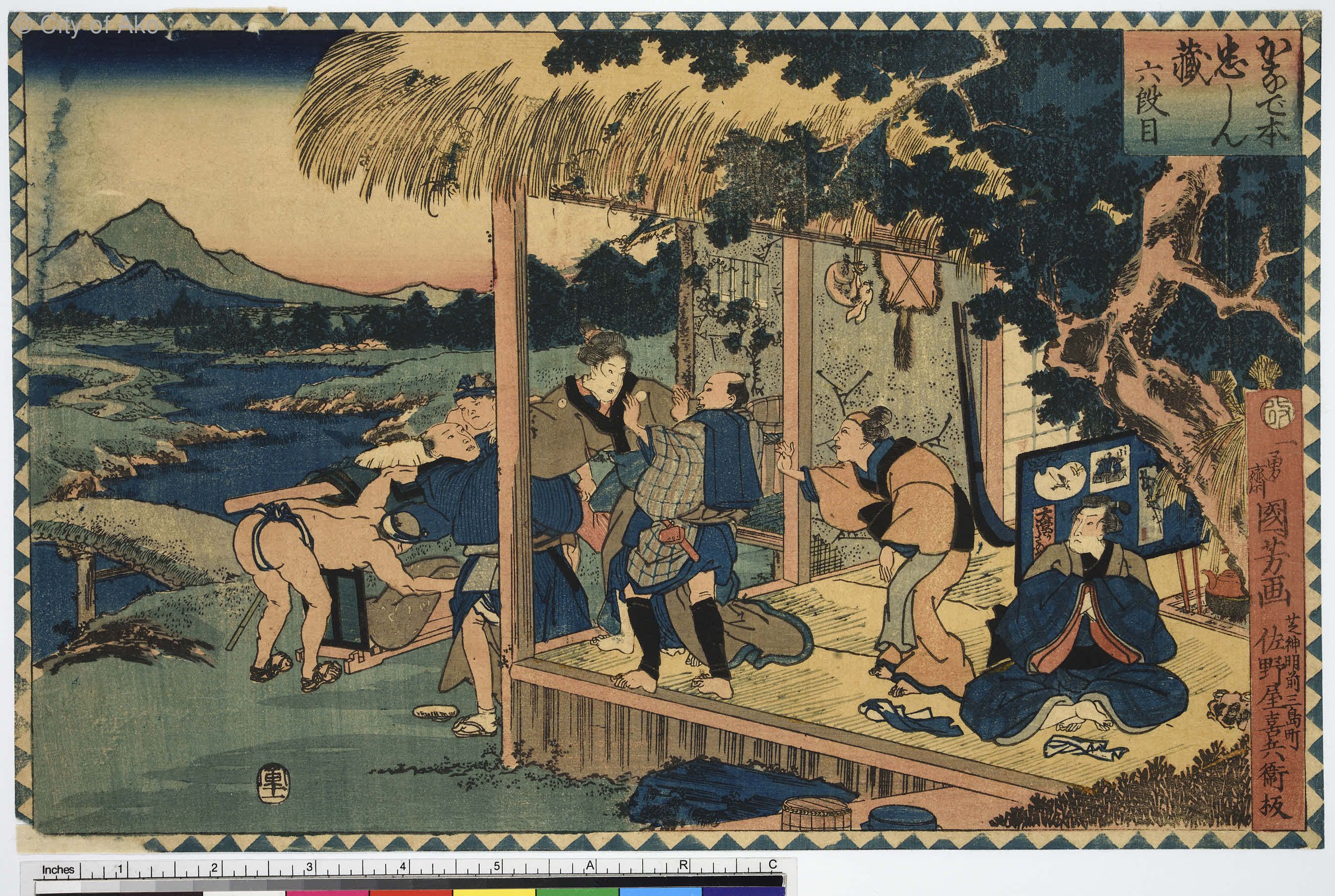 Home E 第五回展覧会 抒情の絵師・広重と奇想の絵師・国芳の忠臣蔵 E2 奇想の絵師・国芳の忠臣蔵 E2.1 物語絵 E2.1.1.06 仮名手本忠臣蔵 六段目 E2.1.1.06 仮名手本忠臣蔵 六段目 絵師:歌川国芳出版:安政元年(1854)判型:横大判錦絵12枚揃のうち所蔵:赤穂市立歴史博物館作品番号:AkoRH-R0036-06 六段目はおかるの実家与市兵衛の住居が舞台。おかるを引き取りにきた祇園の廓一文字屋の話を聞くと、おかる身売りの半金50両を入れて与市兵衛に渡したのが縞の財布であったことがわかり、勘平は昨夜撃ち殺したのは舅であったと思い込む。そして、しかたなくおかるを一文字屋に引き渡す、という別れの場面。この後、勘平は進退窮まって腹を切る。 ID: 26279 Date:2025/11/06 by arc カテゴリ: E2.1 物語絵 [Edit]