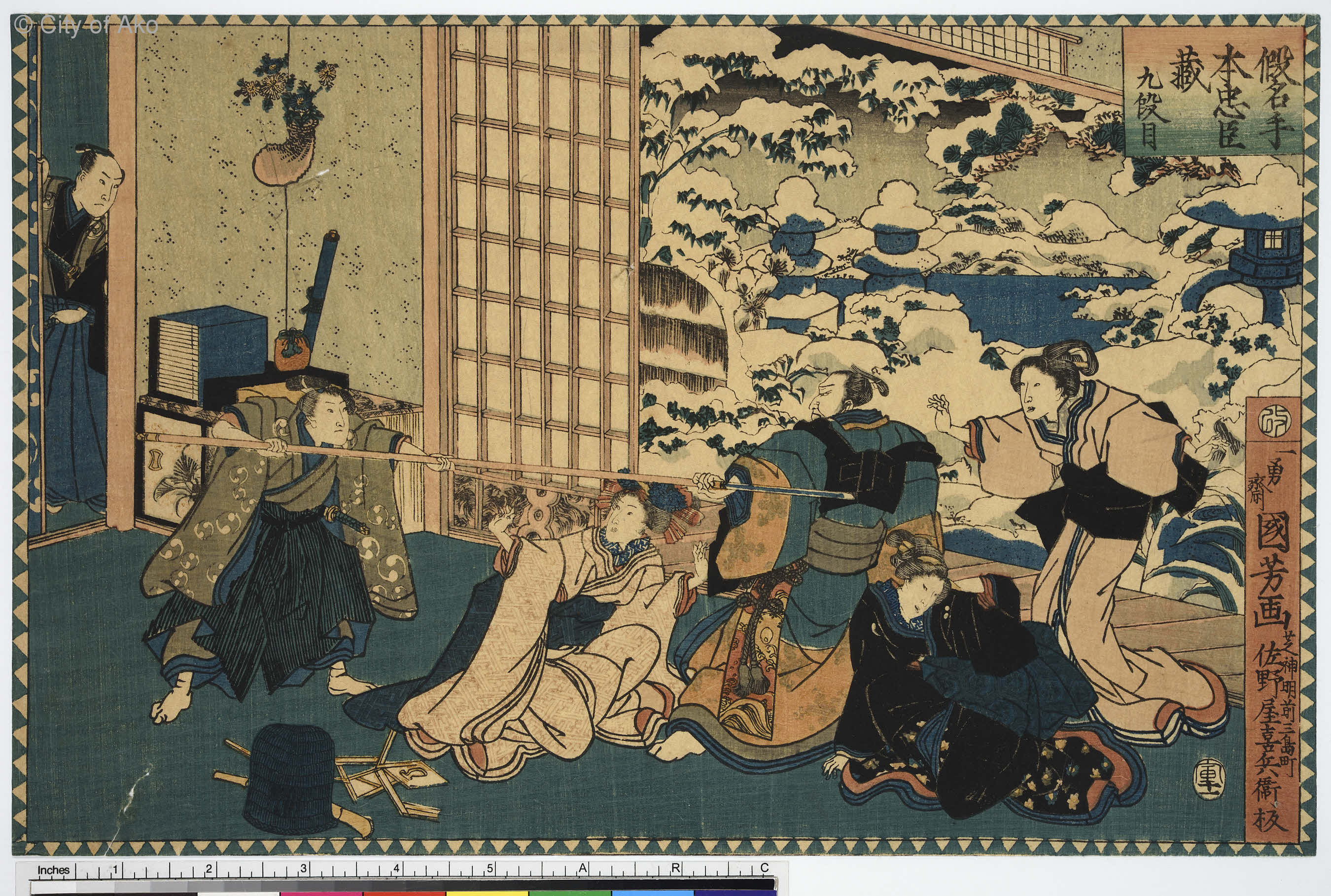 Home E 第五回展覧会 抒情の絵師・広重と奇想の絵師・国芳の忠臣蔵 E2 奇想の絵師・国芳の忠臣蔵 E2.1 物語絵 E2.1.1.09 仮名手本忠臣蔵 九段目 E2.1.1.09 仮名手本忠臣蔵 九段目 絵師:歌川国芳出版:安政元年(1854)判型:横大判錦絵12枚揃のうち所蔵:赤穂市立歴史博物館作品番号:AkoRH-R0036-09 九段目は山科の大星閑居。嫁入りを断られた戸無瀬と小浪が死のうとするところへ、虚無僧姿の本蔵が現れる。故意に憎らしく大星父子をののしる本蔵に力弥が槍で突きかかる場面である。実際の舞台では由良之助は姿を見せないが、本図では左端、襖の陰から由良之助が事の成り行きを見守っている。 ID: 26282 Date:2025/11/06 by arc カテゴリ: E2.1 物語絵 [Edit]