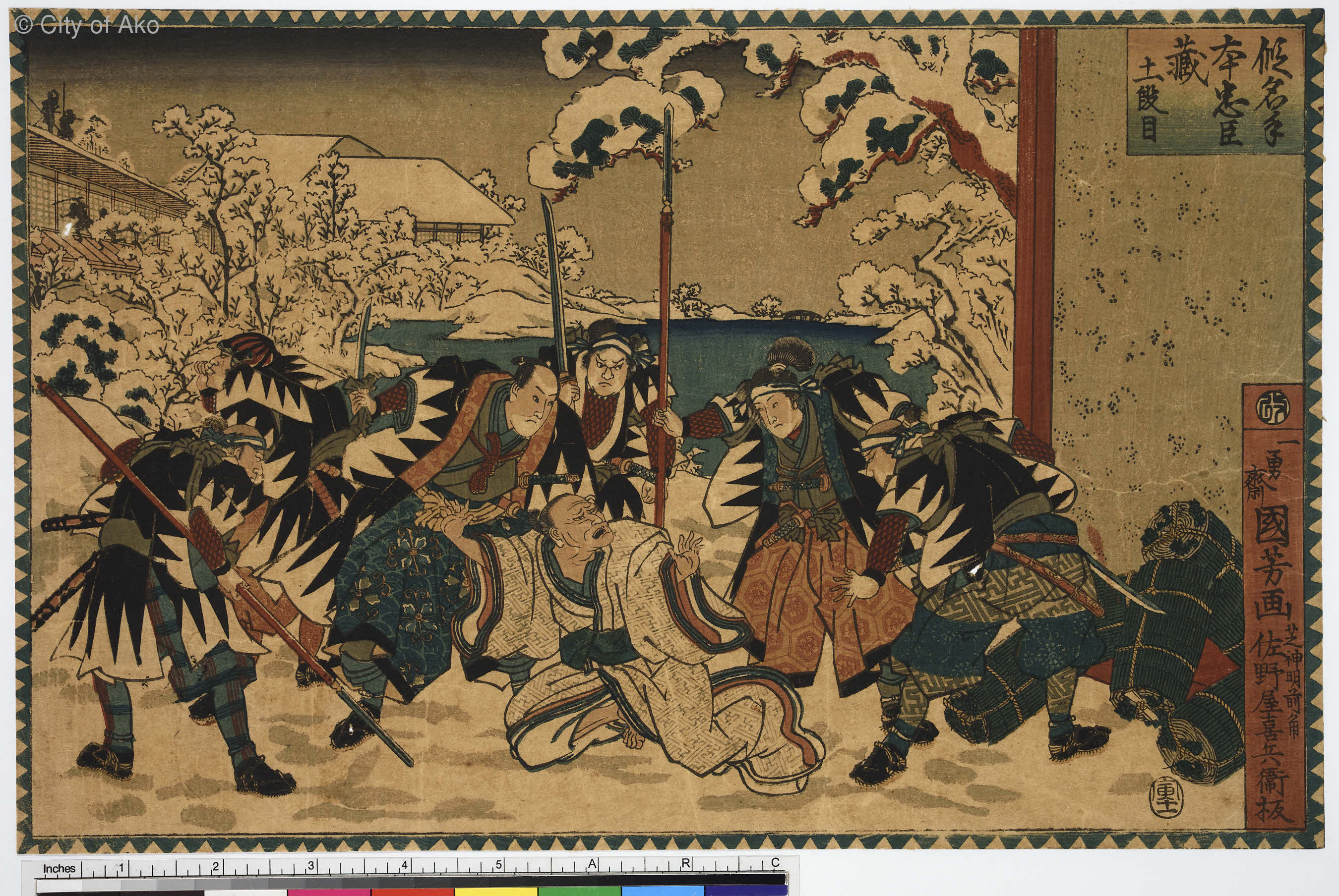 Home E 第五回展覧会 抒情の絵師・広重と奇想の絵師・国芳の忠臣蔵 E2 奇想の絵師・国芳の忠臣蔵 E2.1 物語絵 E2.1.1.11 仮名手本忠臣蔵 十一段目 E2.1.1.11 仮名手本忠臣蔵 十一段目 絵師:歌川国芳出版:安政元年(1854)判型:横大判錦絵12枚揃のうち所蔵:赤穂市立歴史博物館作品番号:AkoRH-R0036-11 物語のクライマックス十一段目は、討入り戦闘シーンではなく、炭小屋に隠れていた師直を見つけ出して取り囲むところを描く。由良之助が師直に生害を促して判官形見の短刀をかざしている。 ID: 26284 Date:2025/11/06 by arc カテゴリ: E2.1 物語絵 [Edit]