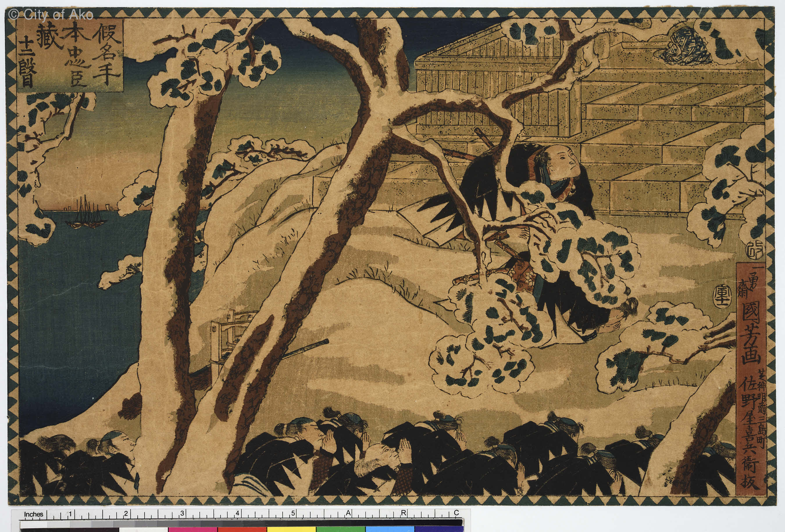 Home E 第五回展覧会 抒情の絵師・広重と奇想の絵師・国芳の忠臣蔵 E2 奇想の絵師・国芳の忠臣蔵 E2.1 物語絵 E2.1.1.12 仮名手本忠臣蔵 十二段目 E2.1.1.12 仮名手本忠臣蔵 十二段目 絵師:歌川国芳出版:安政元年(1854)判型:横大判錦絵12枚揃のうち所蔵:赤穂市立歴史博物館作品番号:AkoRH-R0036-12 「焼香場」を十二段目として描いている。平伏して亡君墓前に首尾を報告する由良之助。他の義士たちは皆一様に両手を合わせて亡君の魂の安寧を祈っている。雪をいただく前景の樹木を大きく描き、墓は土台しか見えず、由良之助以外の義士たちも背後からでほとんど顔は描かれないという構図が特徴的。 ID: 26291 Date:2025/11/06 by arc カテゴリ: E2.1 物語絵 [Edit]