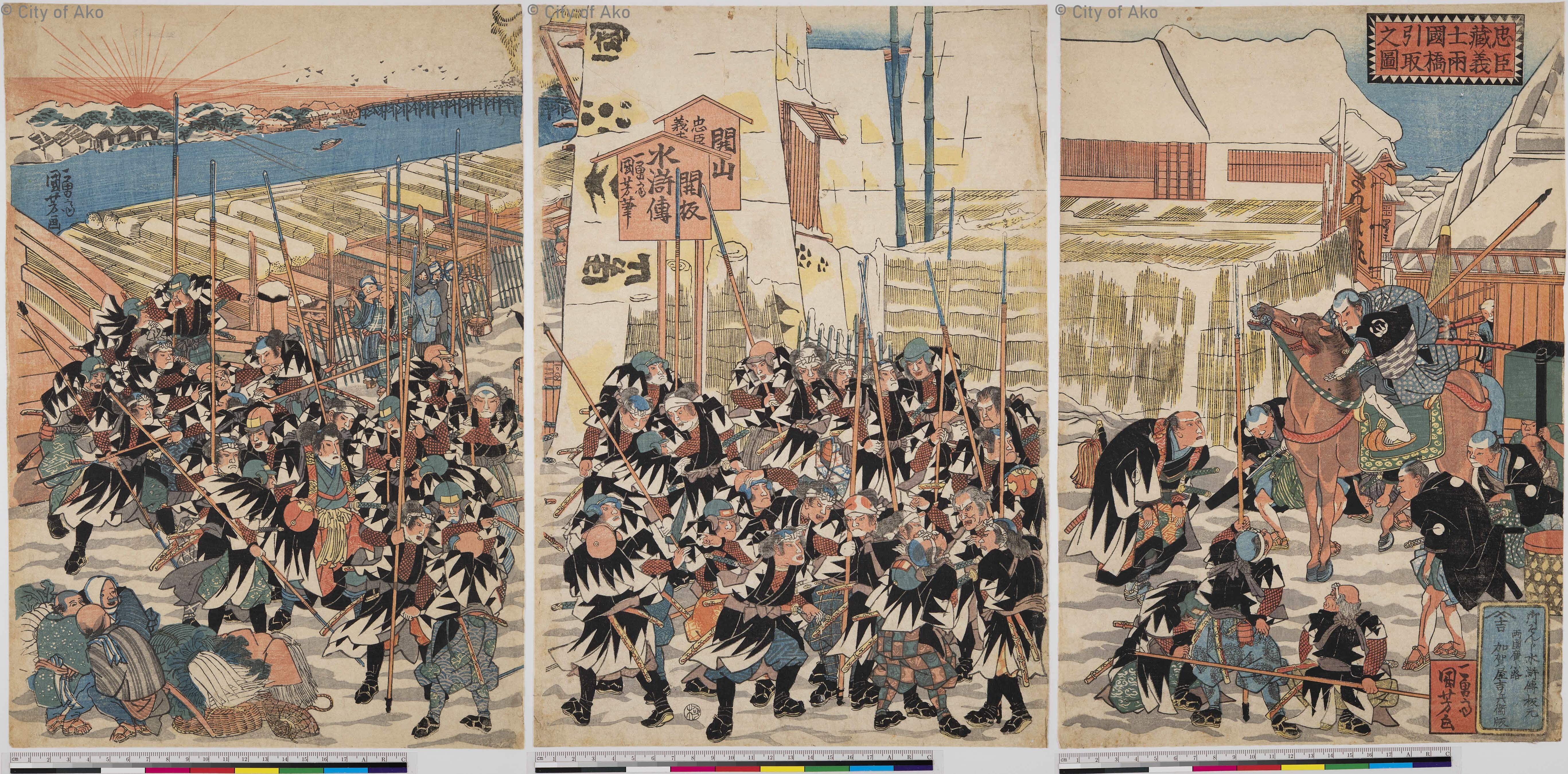 作品番号:AkoRH-S0007-01~03国芳の初期の作例。E2.2.1~4 のように『忠臣蔵』の討入りや両国橋引揚げなどを3枚続でしばしば描いている。