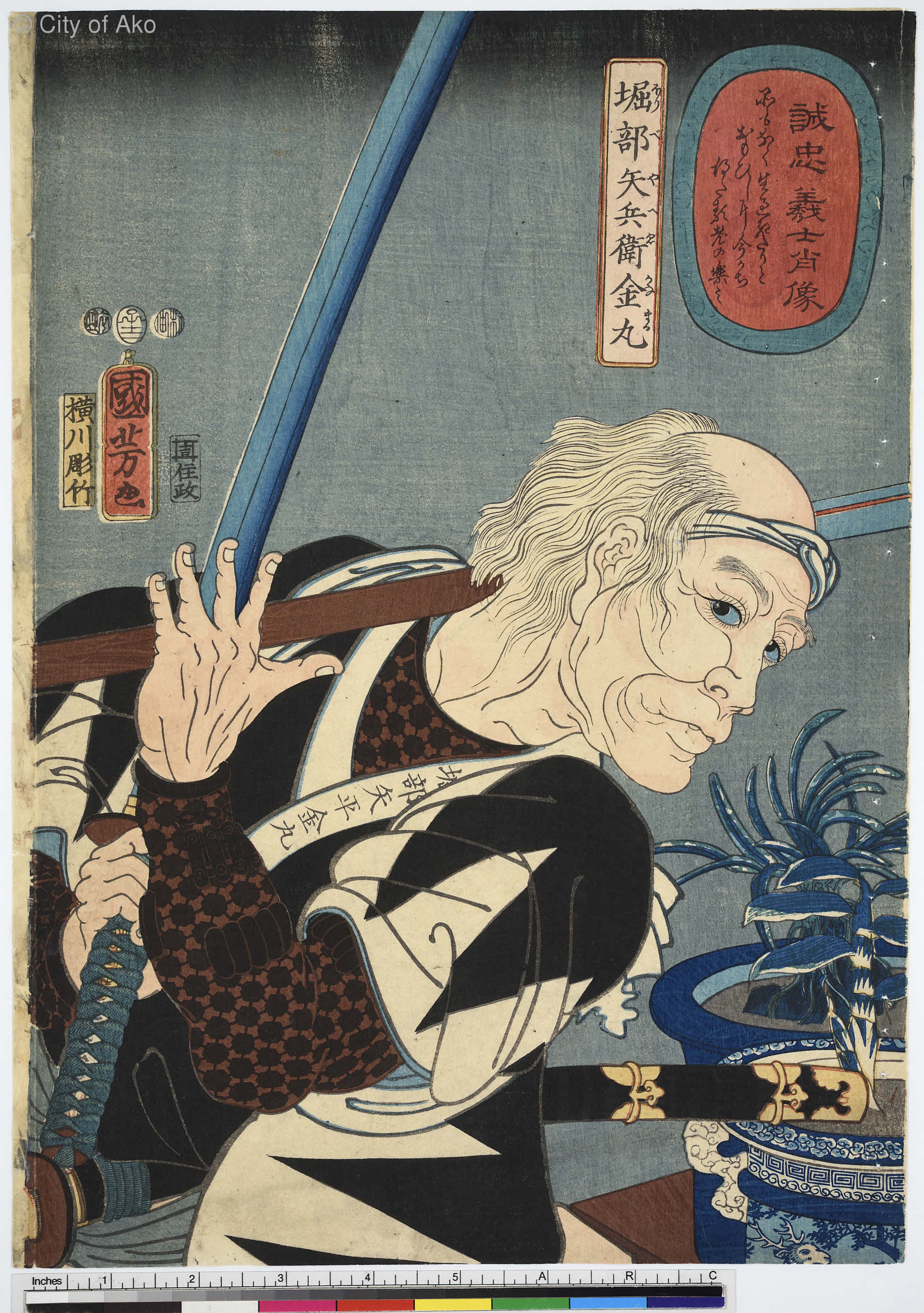 Home E 第五回展覧会 抒情の絵師・広重と奇想の絵師・国芳の忠臣蔵 E2 奇想の絵師・国芳の忠臣蔵 E2.2 武者絵 E2.2.15.2 誠忠義士肖像 堀部矢兵衛金丸 E2.2.15.2 誠忠義士肖像 堀部矢兵衛金丸 絵師:歌川国芳出版:嘉永5年(1852)判型:大判錦絵揃物のうち所蔵:赤穂市立歴史博物館作品番号:AkoRH-R0221-02 実名は堀部弥兵衛金丸。顔めがけて突きかかってきた槍を避け、刀の峰と左手で挟みこむように押さえつける姿。実説の堀部弥兵衛は四十七士中の最高齢者(切腹時77歳)であったが、本図の矢兵衛も白髪と顔に刻まれた深い皺からそれに近い年齢が想起され、敵に向けた鋭い視線からは矍鑠たる人物像が浮かび上がってくる。 ID: 26327 Date:2025/11/06 by arc カテゴリ: E2.2 武者絵 [Edit]