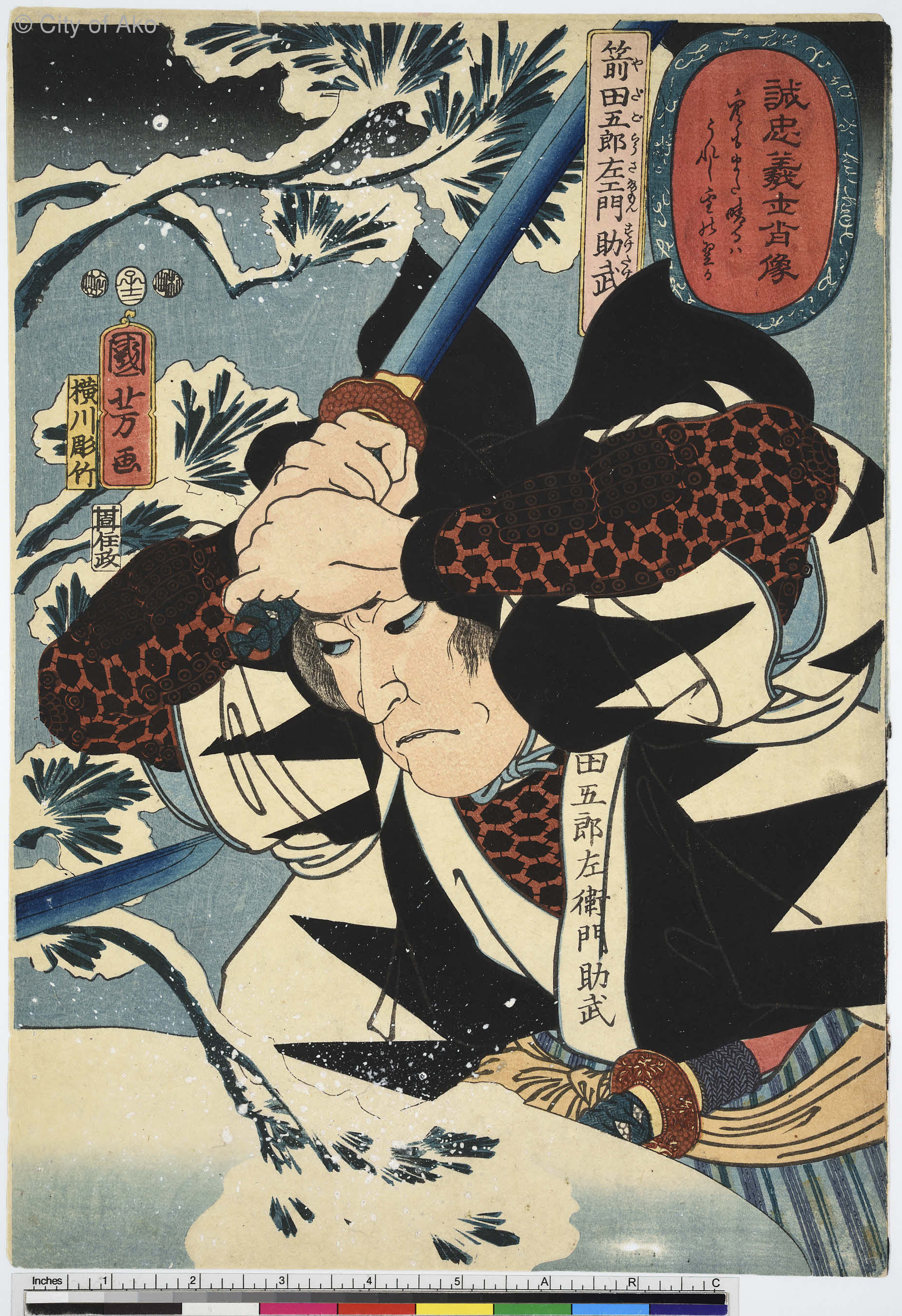 Home E 第五回展覧会 抒情の絵師・広重と奇想の絵師・国芳の忠臣蔵 E2 奇想の絵師・国芳の忠臣蔵 E2.2 武者絵 E2.2.15.3 誠忠義士肖像 箭田五郎左エ門助武 E2.2.15.3 誠忠義士肖像 箭田五郎左エ門助武 絵師:歌川国芳出版:嘉永5年(1852)判型:大判錦絵揃物のうち所蔵:赤穂市立歴史博物館作品番号:AkoRH-R0221-04 実名は矢田五郎右衛門助武。敵の切っ先をかわし、刀を打ち込もうと上段に構える姿である。庭木の枝に刀が触れて、積もった雪が飛び散る様が胡粉散らしで表現されている。 ID: 26328 Date:2025/11/06 by arc カテゴリ: E2.2 武者絵 [Edit]