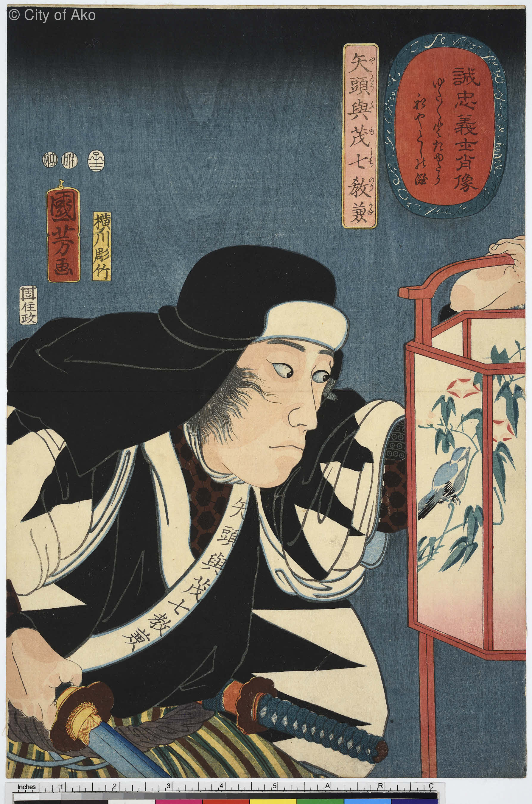 Home E 第五回展覧会 抒情の絵師・広重と奇想の絵師・国芳の忠臣蔵 E2 奇想の絵師・国芳の忠臣蔵 E2.2 武者絵 E2.2.15.4 誠忠義士肖像 矢頭与茂七教兼 E2.2.15.4 誠忠義士肖像 矢頭与茂七教兼 絵師:歌川国芳出版:嘉永5年(1852)判型:大判錦絵揃物のうち所蔵:赤穂市立歴史博物館作品番号:AkoRH-R0221-07 実名は矢頭右衛門七教兼。左手で行灯を持ち上げ、師直を捜索する姿。顔や手の部分に同系色の濃淡による陰影表現が施されている。 ID: 26329 Date:2025/11/06 by arc カテゴリ: E2.2 武者絵 [Edit]