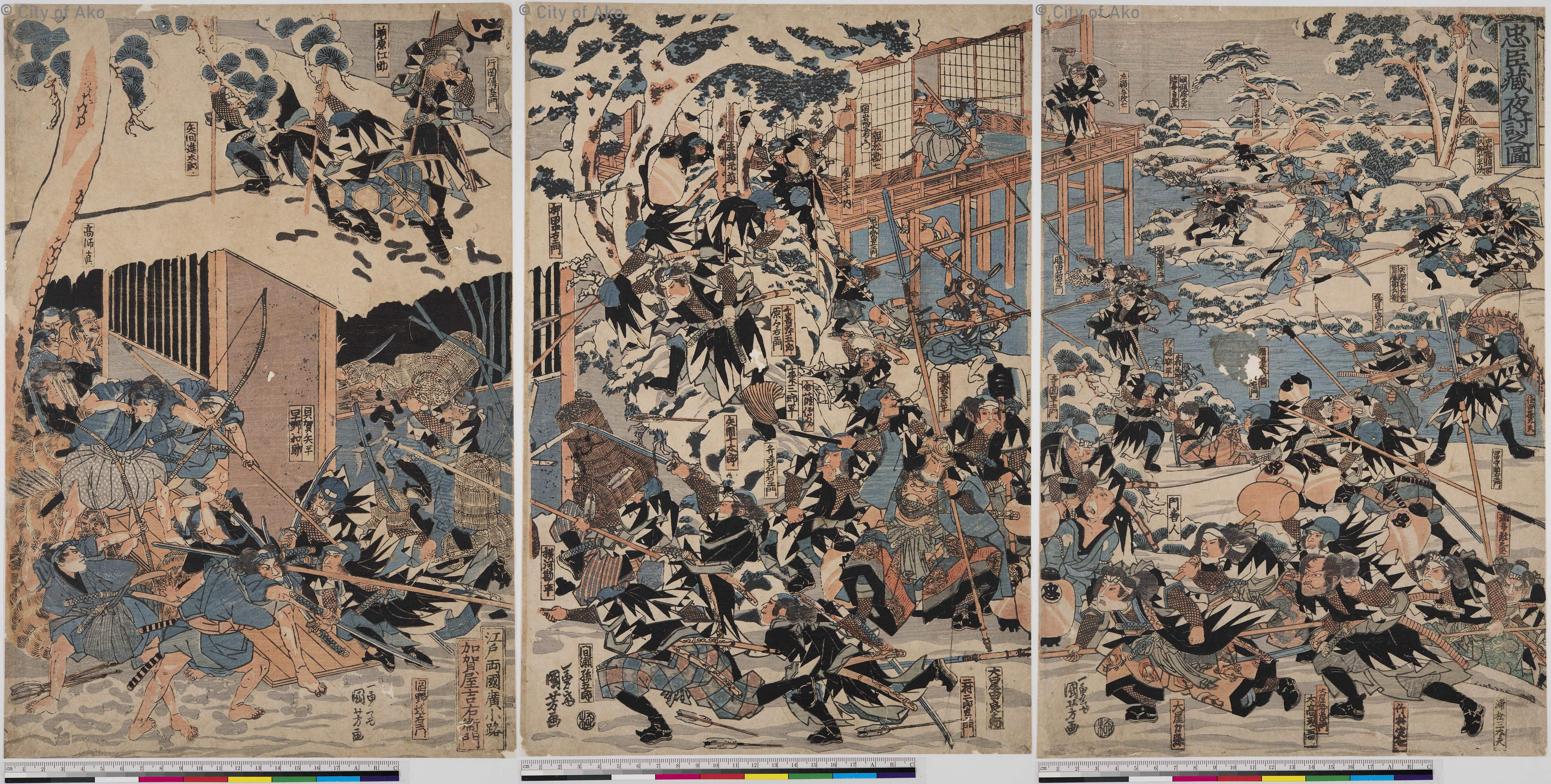 義士の討入りを3枚続のワイド画面に描いている。画面中央の弧を描く樹木を境目にして場面が変わっている。右上部に池に張り出した建物と庭園での戦闘シーンが描かれる。左方の建物は師直が潜む炭小屋で、由良之助の指図で右下方から義士たちが勇んで駆け寄ってくる。小屋の屋根から槍で突いたり、提灯を掲げて呼子笛を吹く者も見える。小屋の前では敵方が槍や弓矢で応戦している。躍動感あふれる構図と描写である。