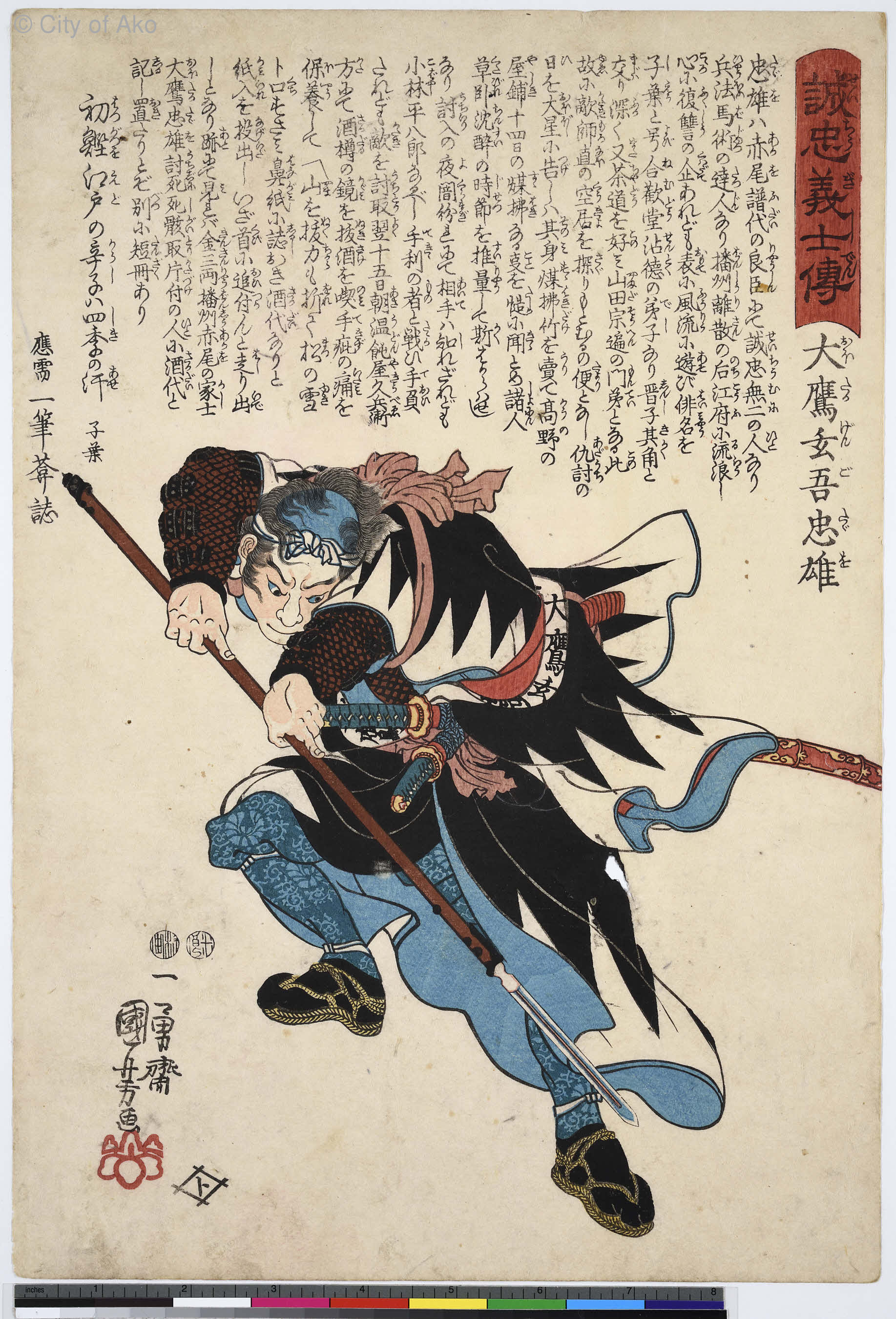 実名は大高源五忠雄。敵方に槍で突きかかる姿である。略伝の最後には、「初鰹(はつがつお)江戸の辛(から)子(し)ハ四季の汗 子葉」と実際に大高源五が詠んだ句が書かれている。子(し)葉(よう)は源五の俳号である。