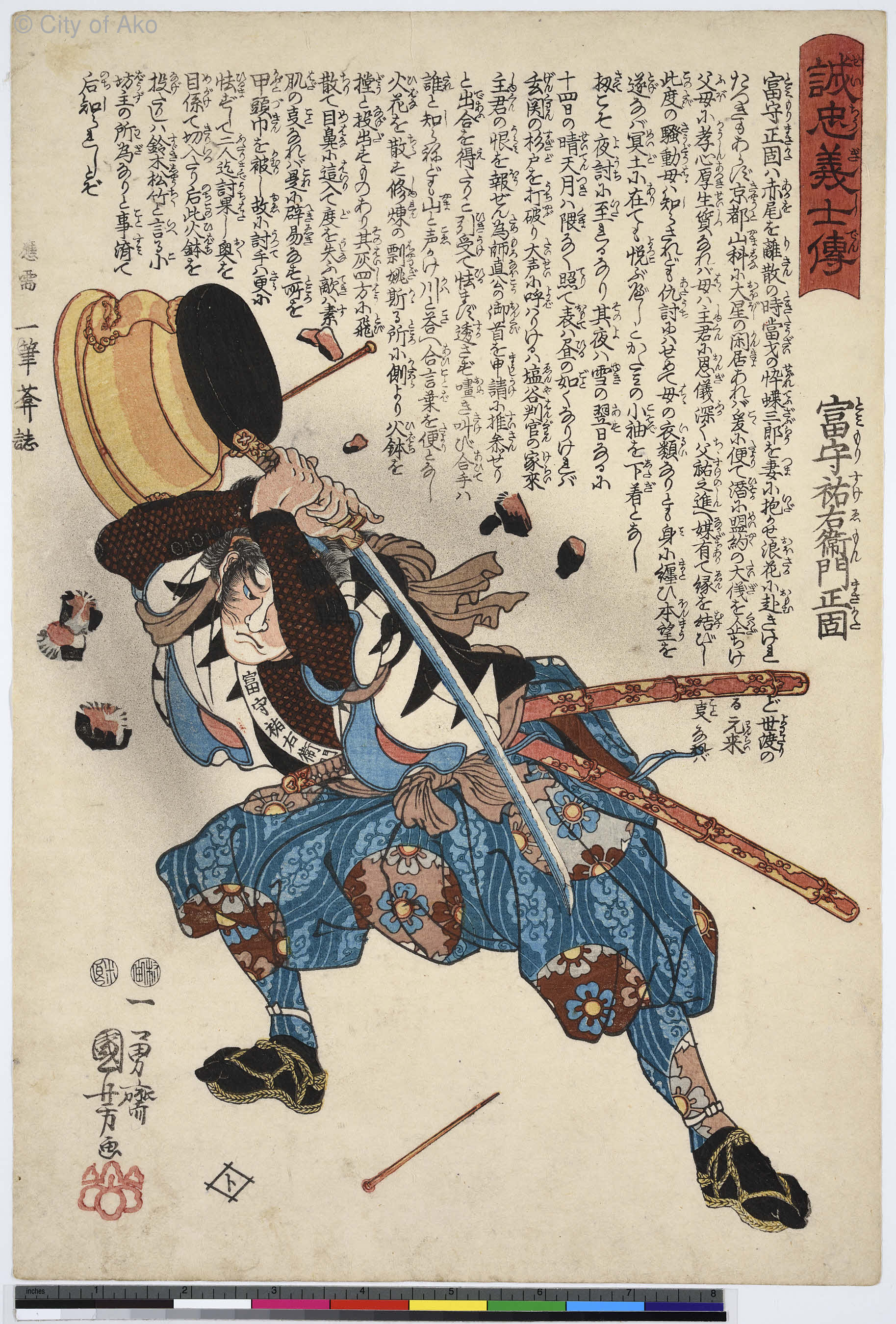 Home E 第五回展覧会 抒情の絵師・広重と奇想の絵師・国芳の忠臣蔵 E2 奇想の絵師・国芳の忠臣蔵 E2.2 武者絵 E2.2.07.04 誠忠義士伝 (二十七) 富守祐右衛門正固 E2.2.07.04 誠忠義士伝 (二十七) 富守祐右衛門正固 絵師:歌川国芳出版:弘化4年(1847)判型:大判錦絵51枚揃のうち所蔵:赤穂市立歴史博物館作品番号:AkoRH-R0340-27 シリーズ第27図。実名は冨森助右衛門正因。敵方が投げつけた火鉢を、刀で頭部をかばいながら身をかがめて避ける姿である。灰が飛び散る様は胡粉散らしの技法によって表現されている。 ID: 26303 Date:2025/11/06 by arc カテゴリ: E2.2 武者絵 [Edit]