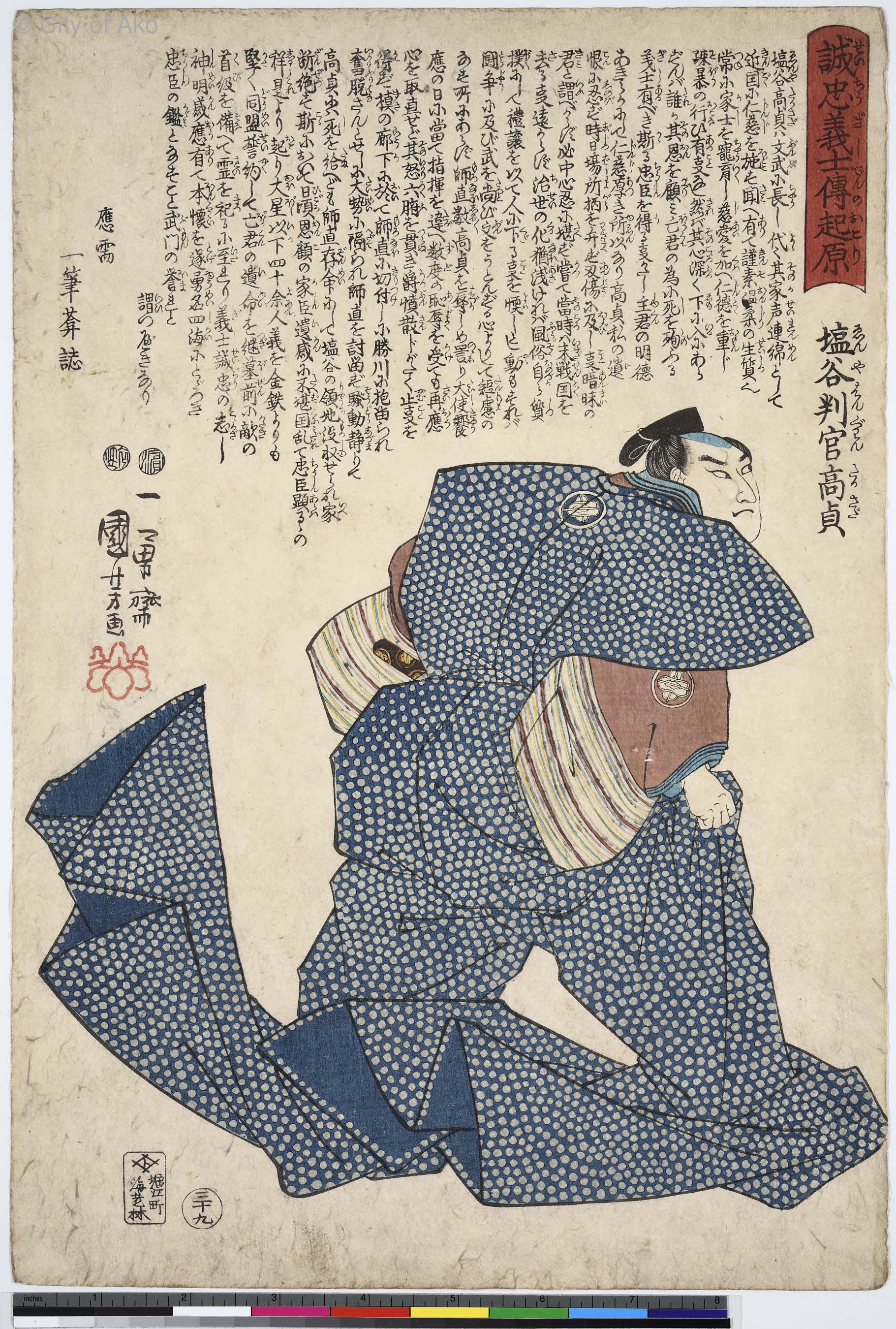 Home E 第五回展覧会 抒情の絵師・広重と奇想の絵師・国芳の忠臣蔵 E2 奇想の絵師・国芳の忠臣蔵 E2.2 武者絵 E2.2.07.08 誠忠義士伝起源 三十九 塩谷判官高貞 E2.2.07.08 誠忠義士伝起源 三十九 塩谷判官高貞 絵師:歌川国芳出版:弘化4年(1847)判型:大判錦絵51枚揃のうち所蔵:赤穂市立歴史博物館作品番号:AkoRH-R0340-39 熨斗目に小紋の長裃を着付けた姿で、師直から受けた恥辱に怒りの表情を見せるところである。 ID: 26307 Date:2025/11/06 by arc カテゴリ: E2.2 武者絵 [Edit]