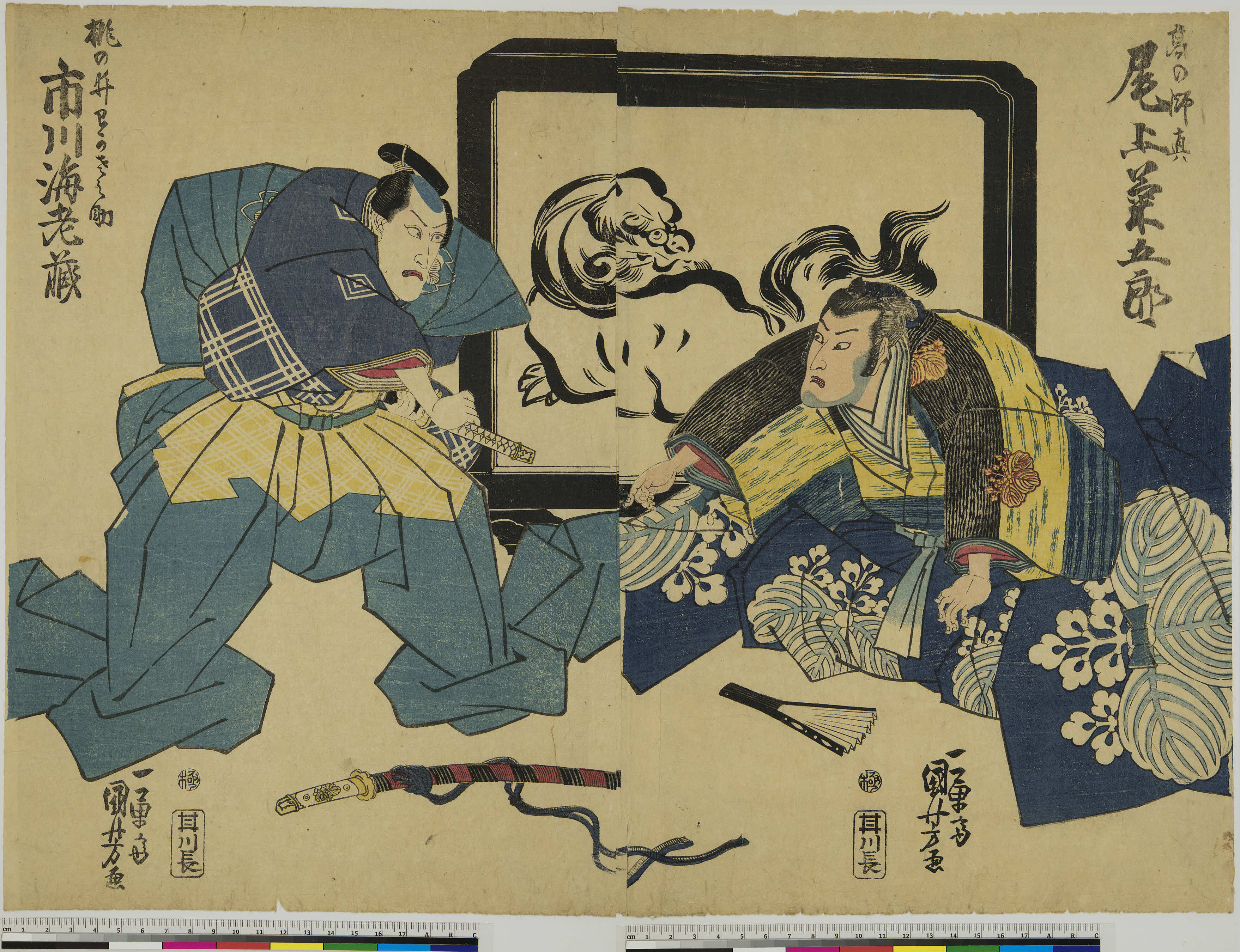作品番号:arcUP7635~7636天保4年3月江戸河原崎座上演の『仮名手本忠臣蔵』の三段目。師直役は三代目尾上菊五郎、桃井若狭之助は五代目市川海老蔵である。饗応の能が催されている御殿での出来事。若狭之助は鶴ヶ岡八幡宮での遺恨から、刀に手を掛け今にも師直を斬る勢いである。ところが、桃井家家老加古川本蔵から賄いを受けたことで、師直の態度は一変。手をついて先の無礼を若狭之助に謝罪する。描かれてはいないが、屏風の後ろには、固唾を呑んで見守る本蔵が忍んでいる。尚、当該『仮名手本忠臣蔵』は、俗に『裏表忠臣蔵』と呼ばれる。「表」とした従来の『仮名手本忠臣蔵』に、書替物の名場面を取り込んだ「裏」の幕をつなぎ、二十二幕に仕立てて好評を博した。本図は「表」の場面である。
