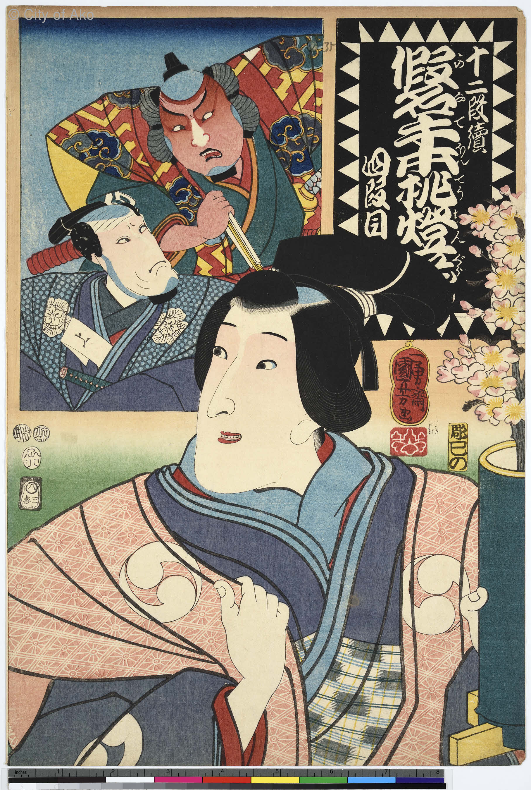 Home E 第五回展覧会 抒情の絵師・広重と奇想の絵師・国芳の忠臣蔵 E2 奇想の絵師・国芳の忠臣蔵 E2.3 役者絵 E2.3.10.3 十二段続 仮名手本挑燈蔵 四段目 E2.3.10.3 十二段続 仮名手本挑燈蔵 四段目 絵師:歌川国芳出版:嘉永5年(1852)判型:大判錦絵揃物のうち所蔵:赤穂市立歴史博物館作品番号:AkoRH-R0100-04 四段目の主題となる人物は、判官に献上する桜を活けた竹筒を持つ力弥で、3代目岩井粂三郎の似顔で描かれている。コマ絵は、判官に切腹の上意を伝える使者の石堂右馬之丞と薬師寺次郎左衛門である。襟元に上書を挿しているのが石堂で、3代目関三十郎の似顔になっている。薬師寺は2代目尾上多見蔵である。 ID: 26353 Date:2025/11/06 by arc カテゴリ: E2.3 役者絵 [Edit]