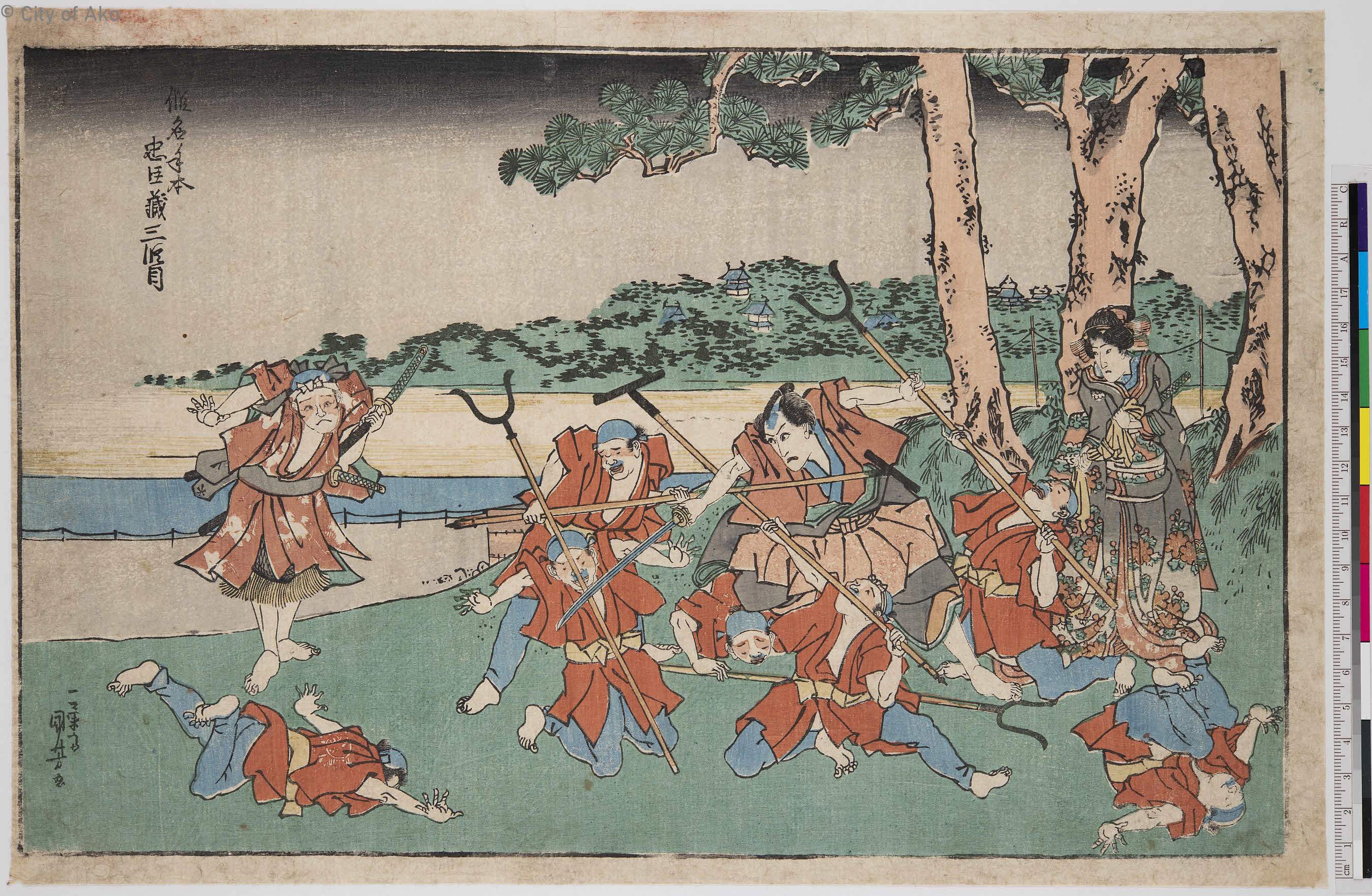 作品番号:AkoRH-S0023E2.3.3.1~3 は、天保6年(1835)8月の森田座、同年9月の市村座でそれぞれ『仮名手本忠臣蔵』が上演されたのに取材した12枚揃のうちの3枚。このシリーズは、初段・四段目・五段目・六段目・七段目・八段目・九段目が森田座、二段目・三段目・十段目・十一段目が市村座の舞台を写している。最後の「十一段目 泉岳寺」は特定されていない。初摺では、図中に描かれている役名とそれを演じた役者名が記載されていたが、後摺ではそれらの文字が削除されている。また、各図の背景は舞台の書割風ではなく、物語絵のような場面描写になっているのが大きな特徴である。