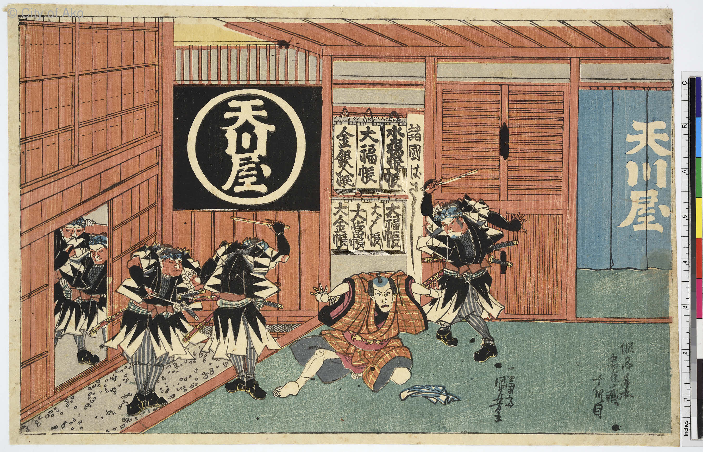 Home E 第五回展覧会 抒情の絵師・広重と奇想の絵師・国芳の忠臣蔵 E2 奇想の絵師・国芳の忠臣蔵 E2.3 役者絵 E2.3.03.3 仮名手本忠臣蔵 十段目 E2.3.03.3 仮名手本忠臣蔵 十段目 絵師:歌川国芳出版:天保6年(1835)判型:横大判錦絵12枚揃のうち 所蔵:赤穂市立歴史博物館作品番号:AkoRH-R0367-02 十段目の本図は、天川屋見世の場面。義平が押し入ってきた捕手たち(衣装は雁木模様の討入り装束をまとっている)に囲まれるところ。天保6年(1835)9月市村座の舞台に取材しており、義平は5代目市川海老蔵である。 ID: 26340 Date:2025/11/06 by arc カテゴリ: E2.3 役者絵 [Edit]