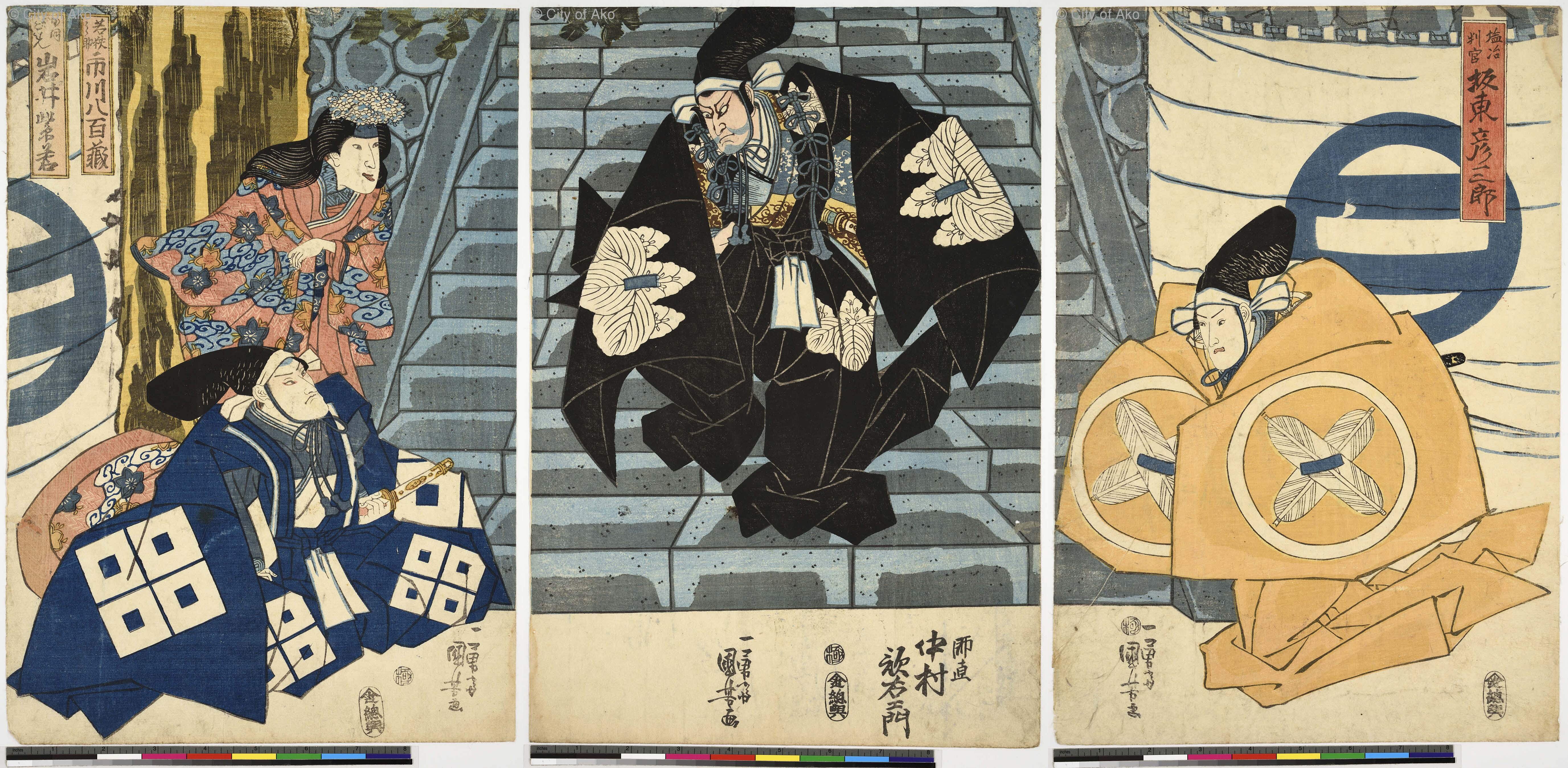 作品番号:AkoCH-S0007-01~03天保10年(1839)7月、中村座での『忠孝義士由良意(ぎしのゆらい)』に取材したもの。この芝居は、詳しい筋書きは不明であるが、『歌舞伎年表』によれば「忠臣蔵」と「弥作鎌腹」を上演したものとあり、この時が初演。