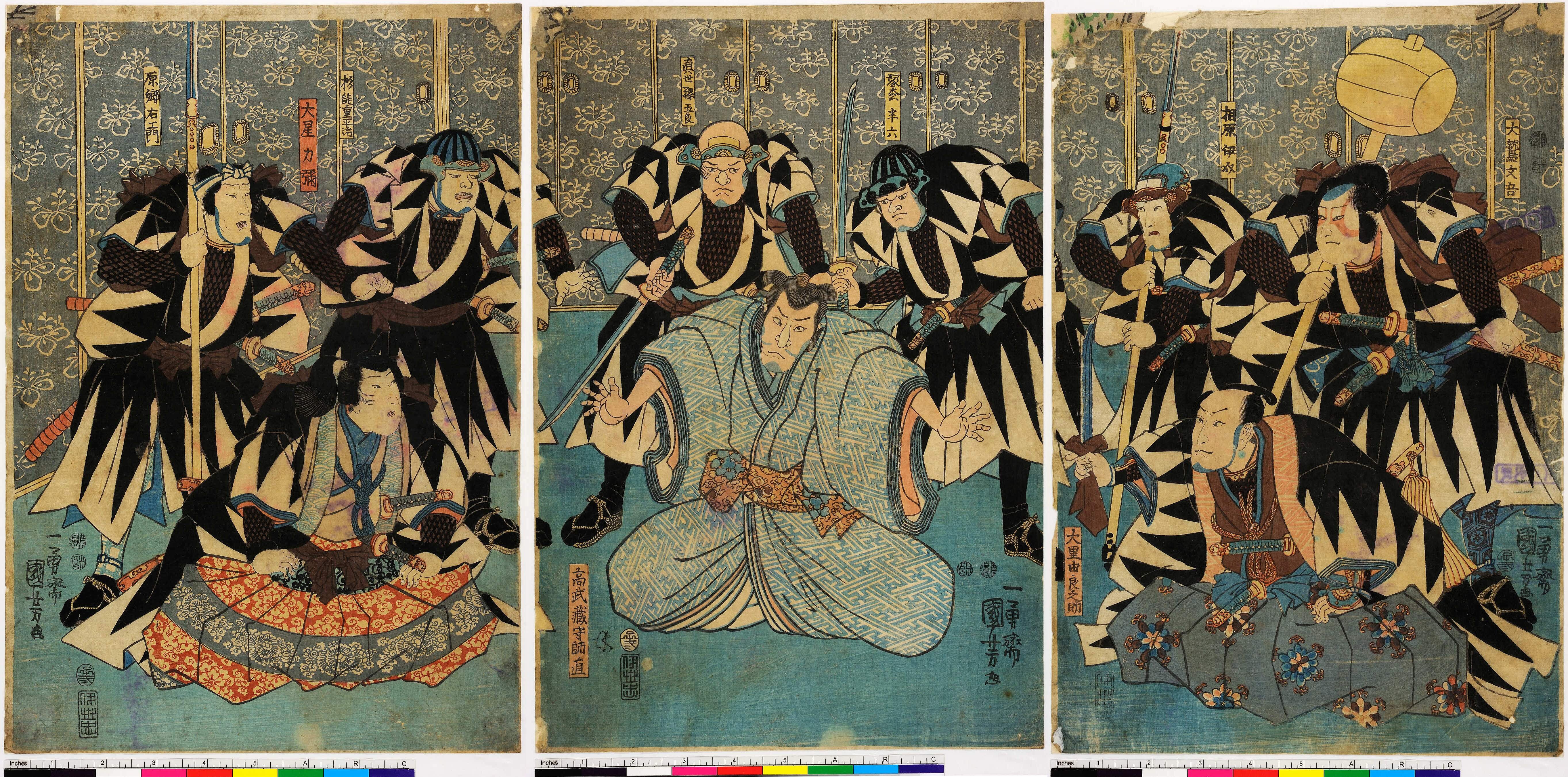 作品番号:arcUP0426~0428嘉永5年3月江戸中村座において「寎花いろは本説(やよいのはないろはのほんぜつ)」が上演された。番付に「出雲が作に基きてつまなかさねその古歌の手爾葉も新らしく銘々伝奇の実録を拙筆に」云々とあり、竹田出雲作「仮名手本忠臣蔵」を基本に置きながらも、義士銘々伝の場を新たに加えた芝居であった。由良之助役を当たり役とした三代目坂東彦三郎楽善の二十七回忌追善興行でもあり、大星由良之助役は四代目坂東彦三郎に任された。本図は大切、敵討の場。中央で目を見開く人物は、遂に義士たちに見付かり詰め寄られる高武蔵守師直、演じるのは十一代目森田勘弥である。その右に四代目坂東彦三郎の大星由良之助、左に初代吾妻市之丞の大星力弥。後ろに控える義士は、右から大鷲文吾、相原伊助、塚松半六、真世孫五郎、杉能重平治、原郷右衛門である。