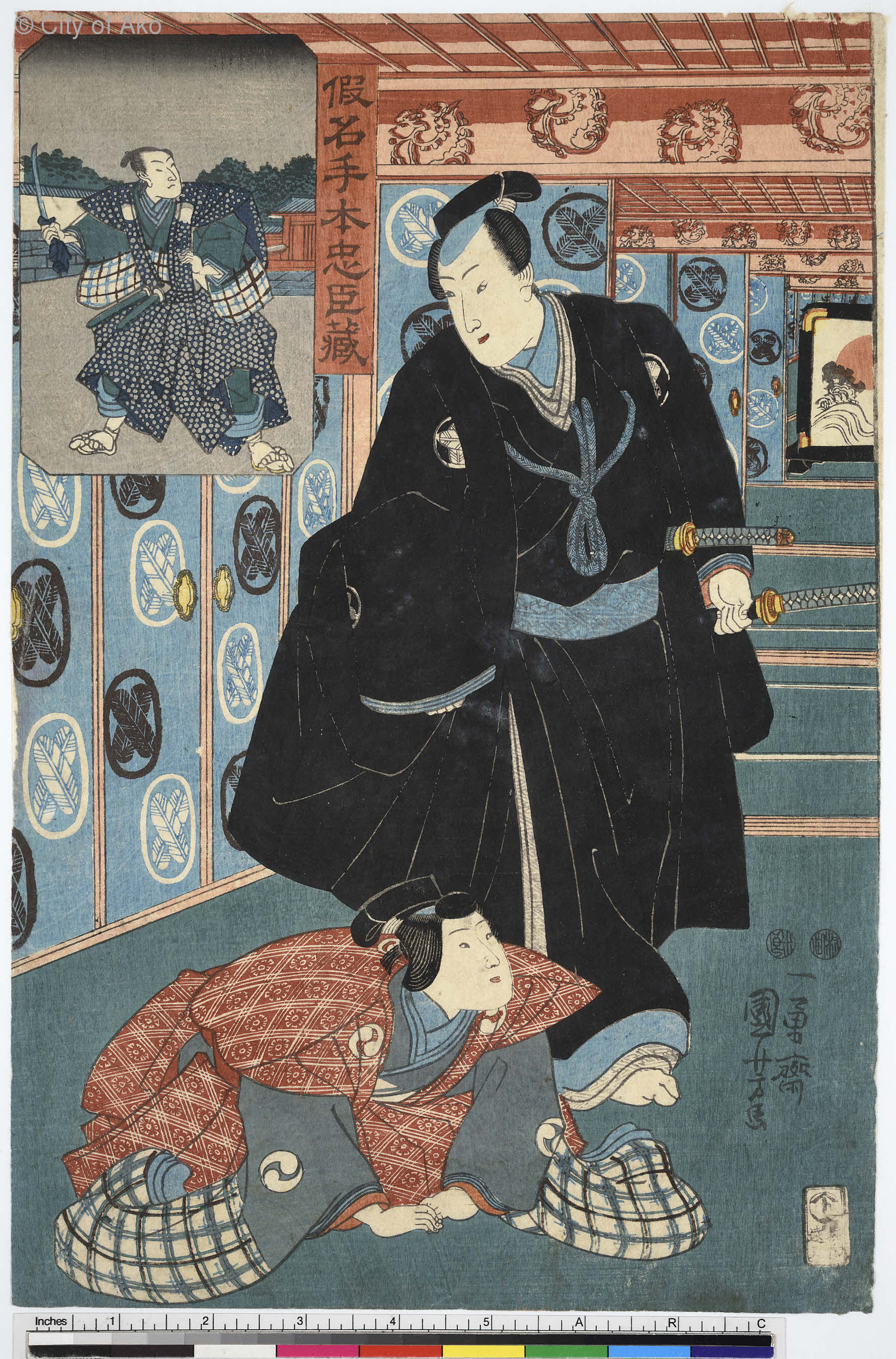 四段目は塩冶館が舞台。襖という襖には家紋の「丸に鷹の羽」紋が散らされている。力弥が判官に上使の到来を告げるところであろうか。今日の舞台ではこのような演出は見られない。判官は黒の着付に黒の羽織、大刀を左手に持ち、小刀を左脇に差す姿である。実はこの着衣の下には白の死装束を着込んでいるのである。判官は12代目市村羽左衛門の似顔で、力弥は3代目岩井粂三郎であろう。コマ絵は、判官形見の短刀を握りしめ、仇討ちの決意を胸に館を退去する由良之助を描いている。