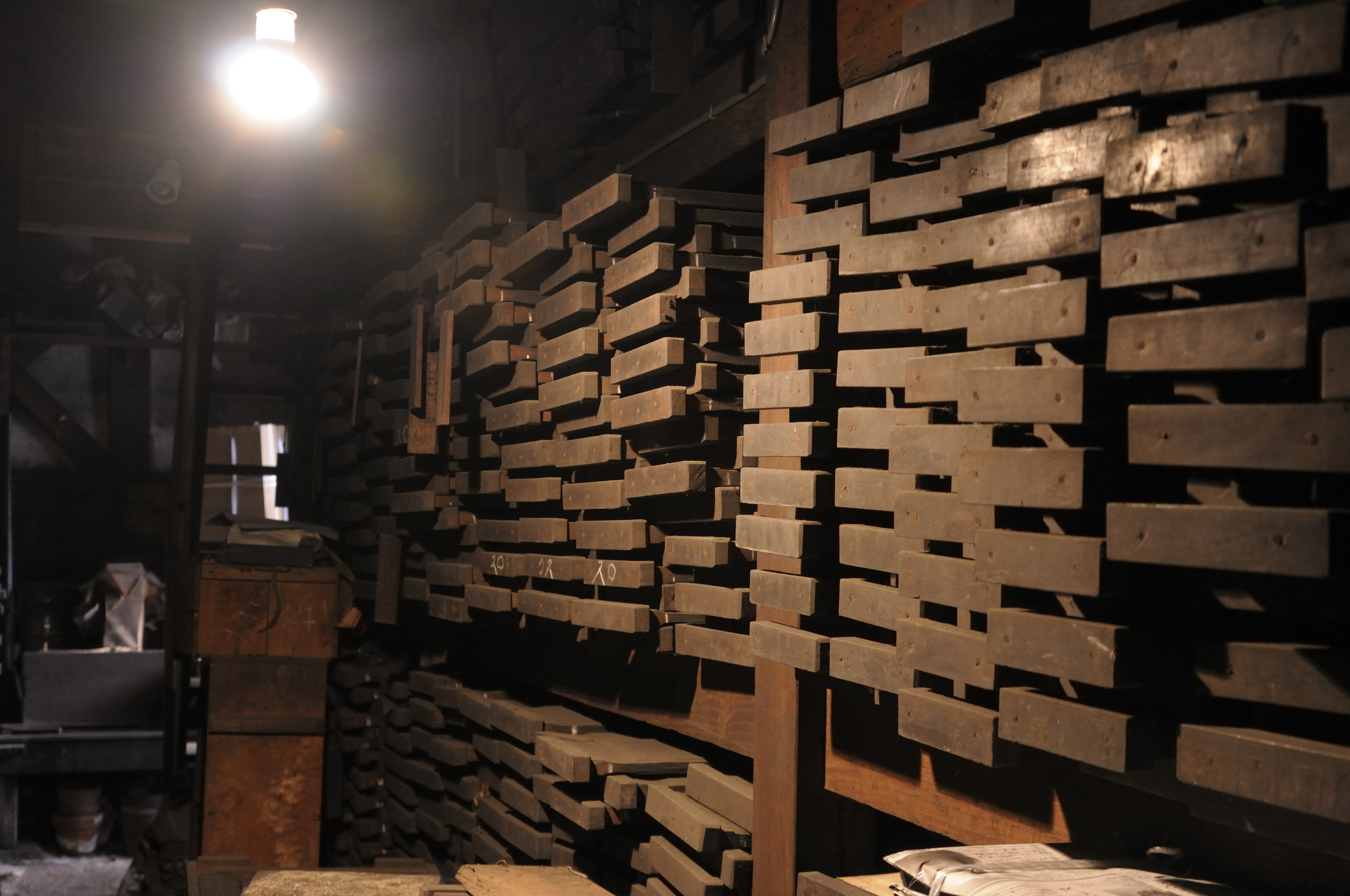 江戸時代、出版の発祥地であった京都では多くの板元が活動しており、当然、それぞれに板木蔵や板木小屋が存在していたはずですが、法藏館以外に、当時のまま現存する板木蔵は例がありません。まとまった分量の伝来の明確な板木が保存されていることはもちろん貴重ですが、板木蔵ごと現存している点がさらに貴重と言えるでしょう。その内部には、滑車や墨壺、紙型など、出版活動を髣髴とさせるモノもいくつか収まっており、近世や近代にタイムスリップした感を味わわせます。