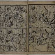一方、江戸では、元禄10年(1697)に上方の狂言本を倣って出版が始まったが、宝永期(1710頃)には消滅し、世界中を探しても現在70点程度しか残っていない。本作品は、同じタイトルで3点の伝存が確認できる作品であるが貴重本である。挿絵は、鳥居派で、見開き3枚から4枚が含まれる。筋書きを含めて丁数(頁数)は10丁程度で量は限定されているものの、文字はびっちりと細字で書かれており、挿絵の内容と相まって、十分に内容を把握できるほどの情報が詰まっている。元禄歌舞伎の実態を具体的に知るためには、最重要資料である。